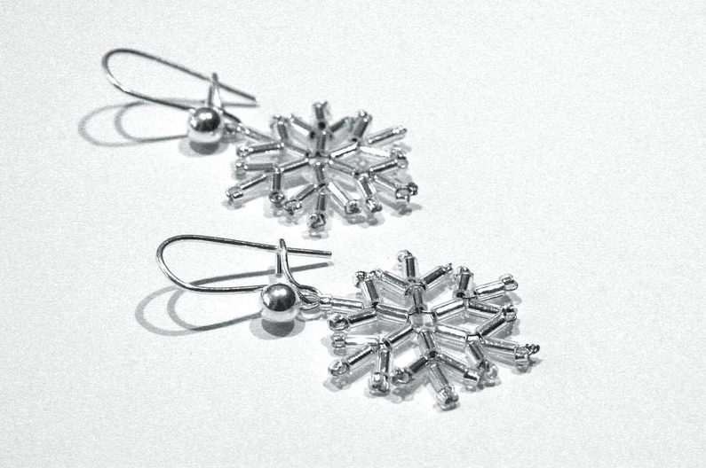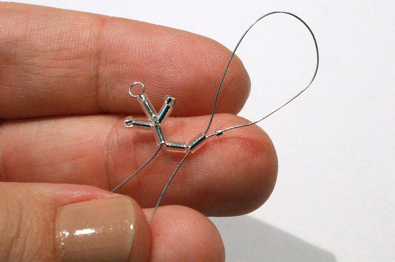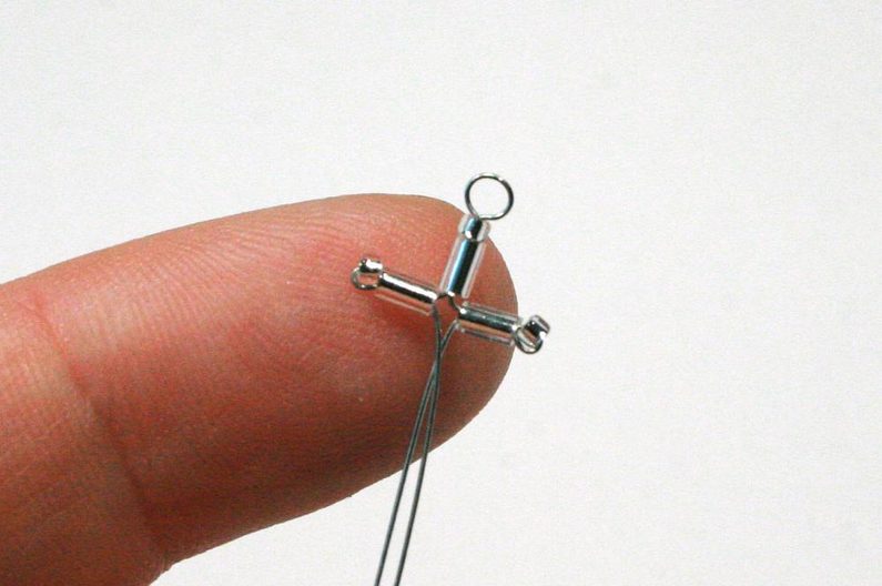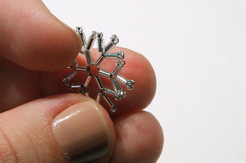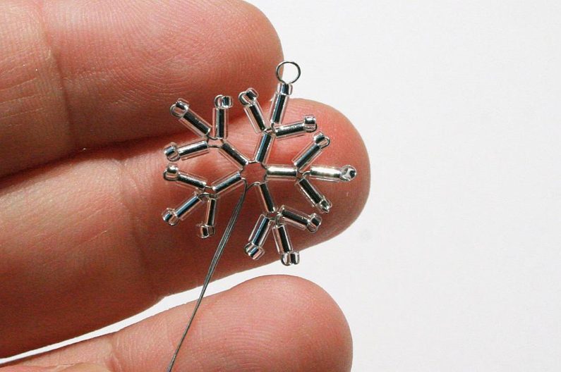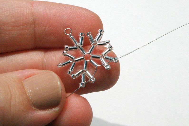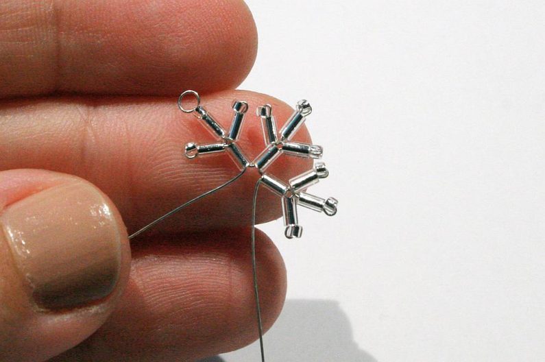 Pro sněhovou vločku budete potřebovat cca 30 cm drátu. Rozdělte ho na půlku a uprostřed udělejte ketlovacími kleštěmi očko (pak to očko použijete na zavěšení; obr. 1). Na diagramu je začátek navlékání na drátek naznačen šipkou. (obr. 2)