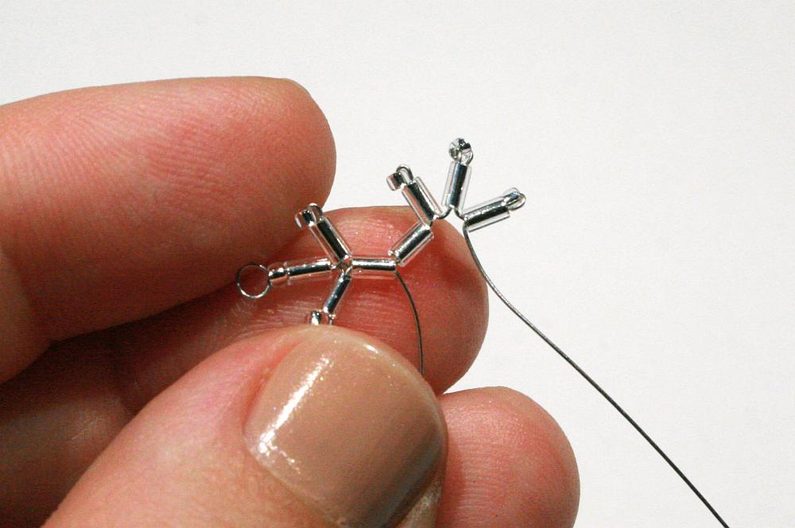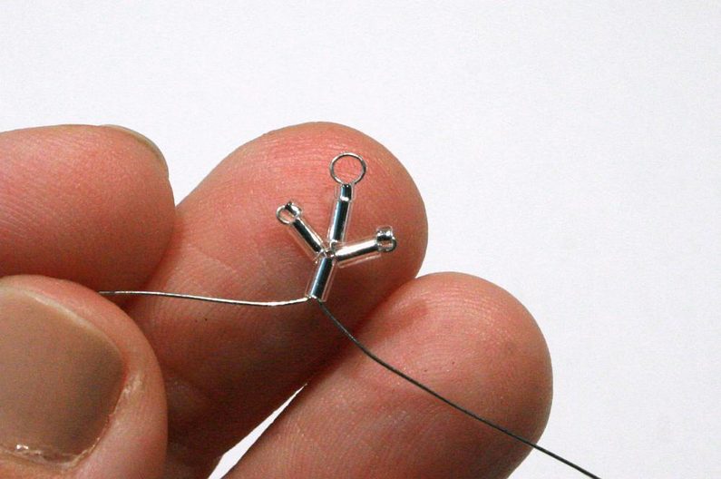 Teď budete pracovat jenom s jedním drátkem: navlékněte na drát 2 tyčky a 1 korálek, který přeskočte a projděte přes jednu tyčku (vytvoří se vám větvička; obr. 7-8), dále obdobně vytvořte ještě dvě větvičky (obr. 9). Teď přejděte drátkem přes zbývající tyčku (obr. 10-11).