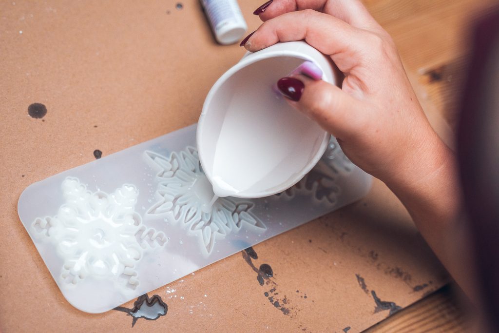 • Rozmícháme si křišťálovou pryskyřici podle instrukcí na obalu. Do hmoty přidáme bílé barvivo nebo případně i třpytky.