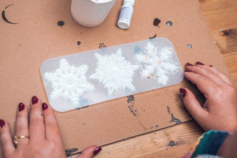 • Vše necháme minimálně 24 hodin zatvrdnout. Před vyjmutím z formy se ujistěte, že povrch výrobku je pevný a nelepí. Vločky můžeme zavěsit na ozdobný provázek přímo na stromeček nebo třeba na záclony.