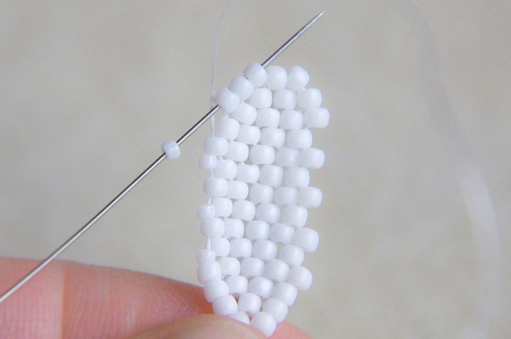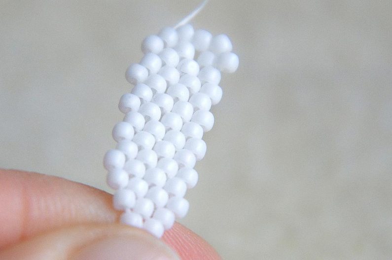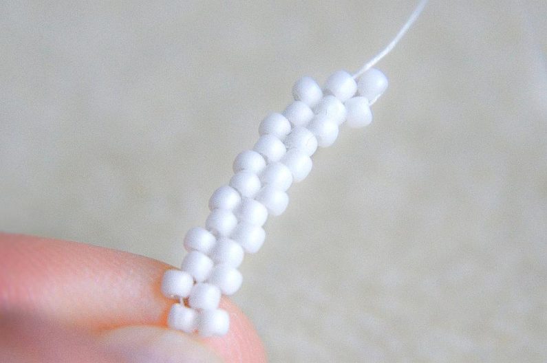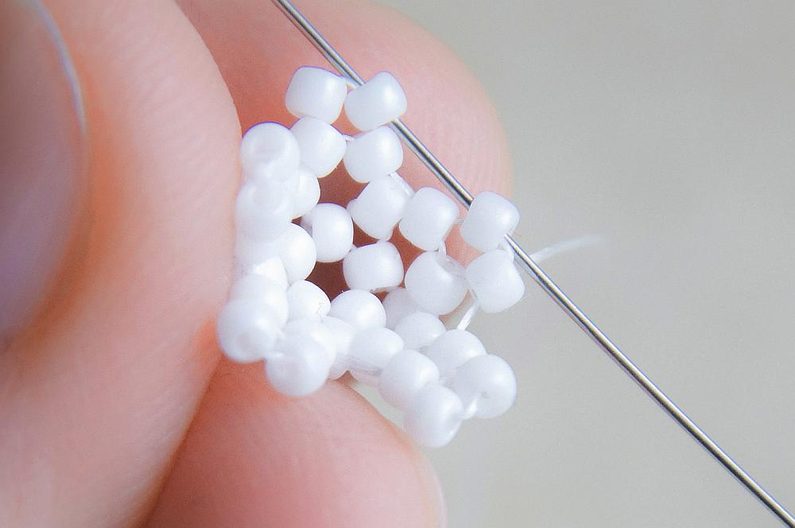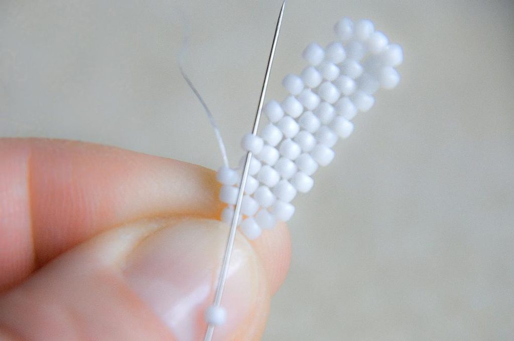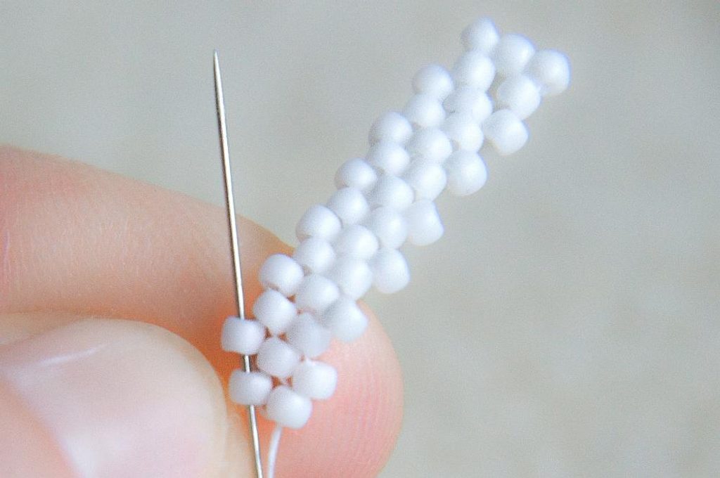 Na konci řady (počítáme si korálky v sloupci, aby ve všech sloupcích byly tři dvojice korálků nad sebou) provlékneme zespodu dva krajní korálky a utáhneme.