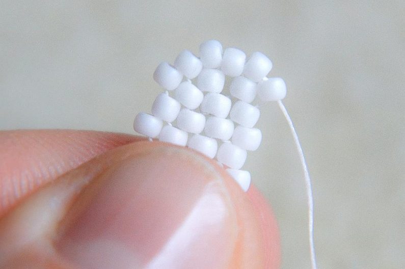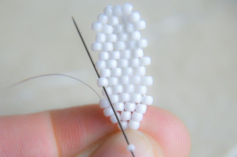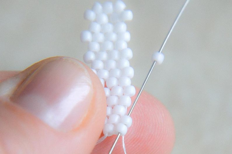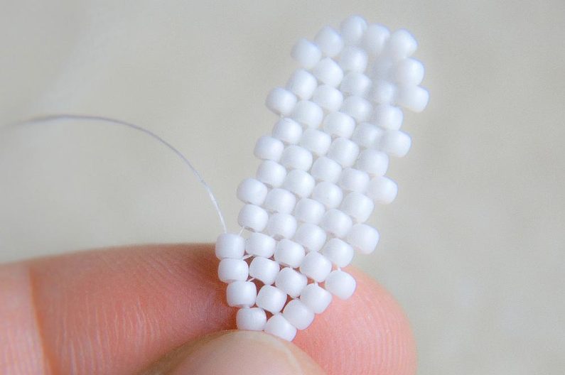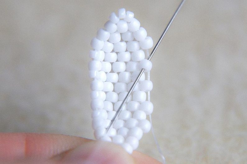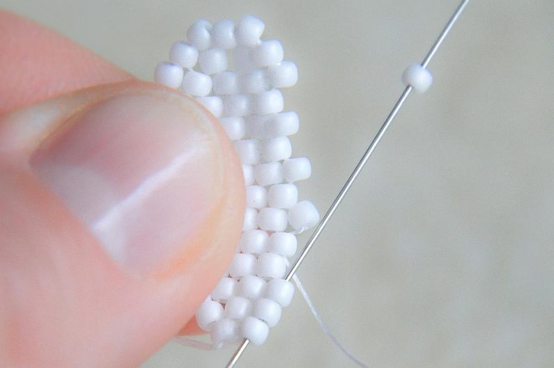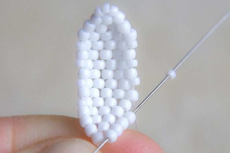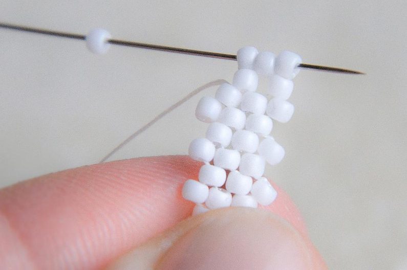 Na konci řady (počítáme si korálky v sloupci, aby ve všech sloupcích byly tři dvojice korálků nad sebou) provlékneme zespodu dva krajní korálky a utáhneme.