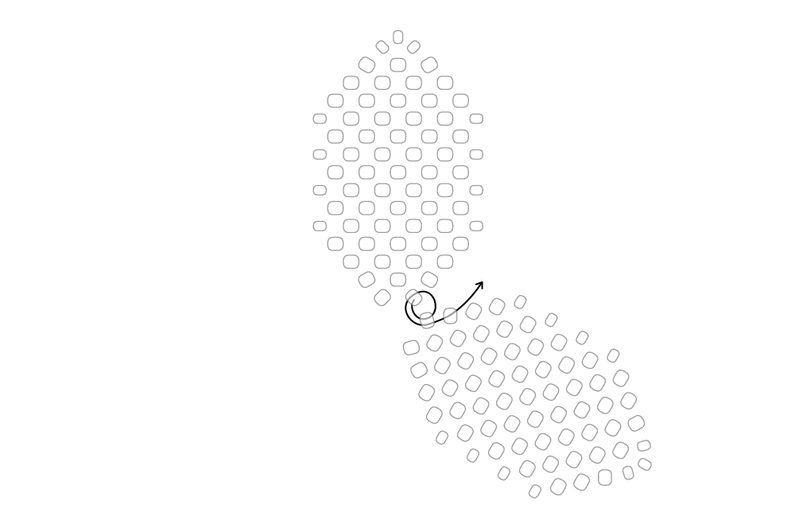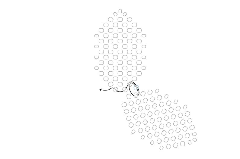 Přidané korálky urovnáme "na plocho", aby tvořily "stromeček" (šijeme herringbone stehem). Provlékneme zespodu následující korálek z poslední přidané řady.