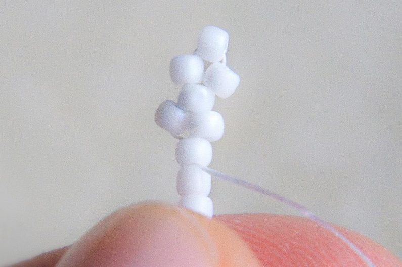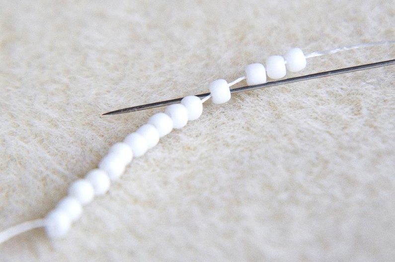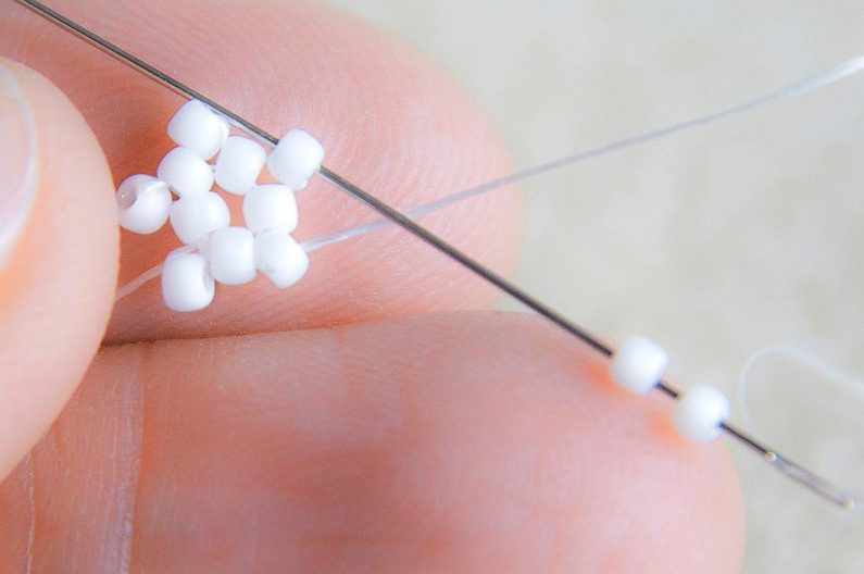 Na nit dlouhou cca 0,75m navlékneme 1 TOHO 11/0 (šijeme bílými korálky), korálek provlékneme v protisměru a stáhneme cca 10cm od konce nitě. Bude to taková "stopka", která bude držet ostatní navlečené korálky, aby se nám z konce nitě nevyvlékly.