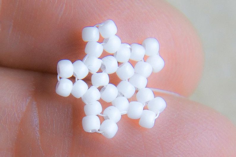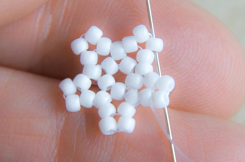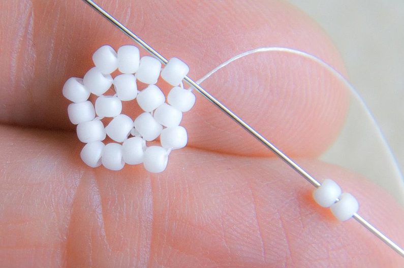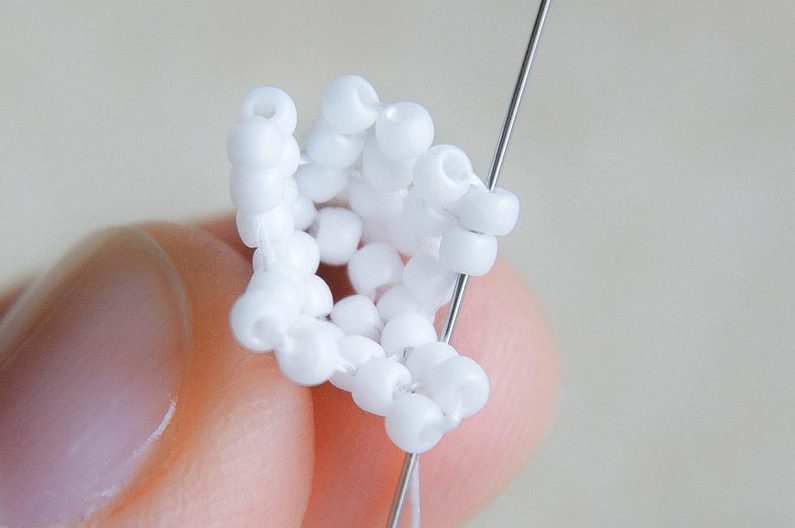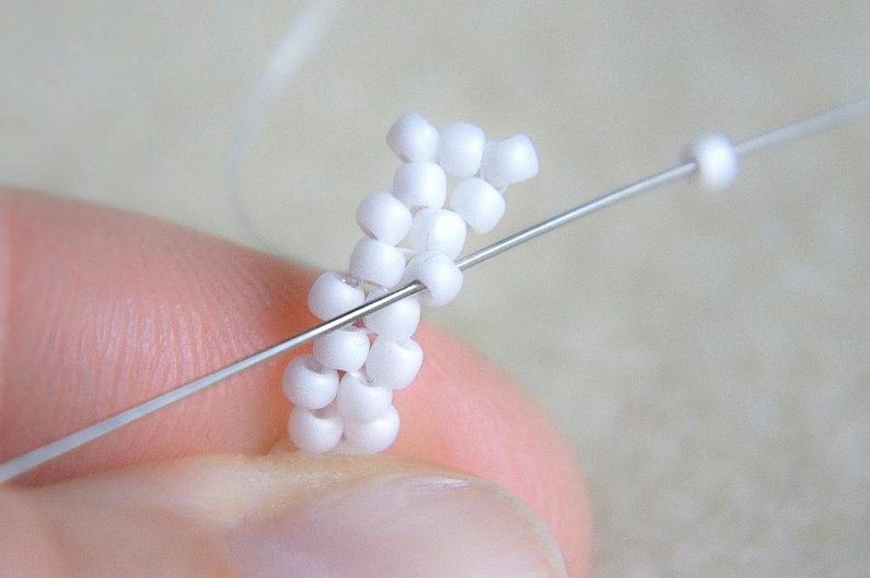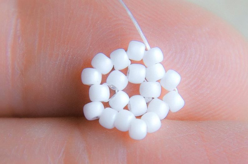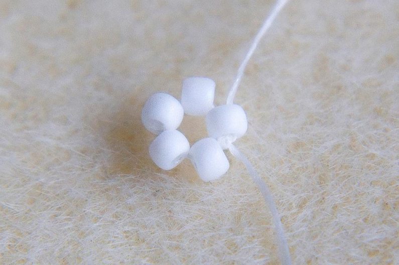 Na nit dlouhou cca 0,75m si navlékneme 5 korálků TOHO 11/0 (šijeme bílými korálky), asi 10cm od konce si uděláme uzlík a vznikne nám malé kolečko. Provlékneme ještě i jeden následující korálek.