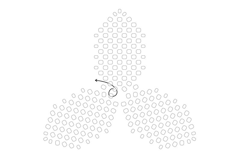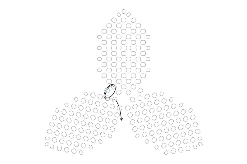 Prošijeme se na okraj třetího lístku a v protisměru prošijeme první korálek prvního lístku.