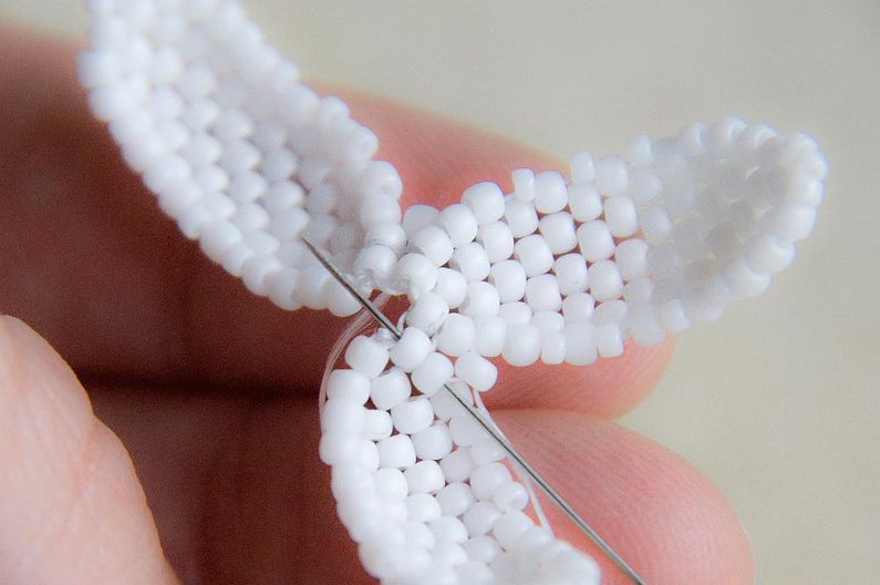 Vrátíme se druhou stranou korálkem prvního lístku, ze kterého vycházela nit. Přitáhneme lístky k sobě.