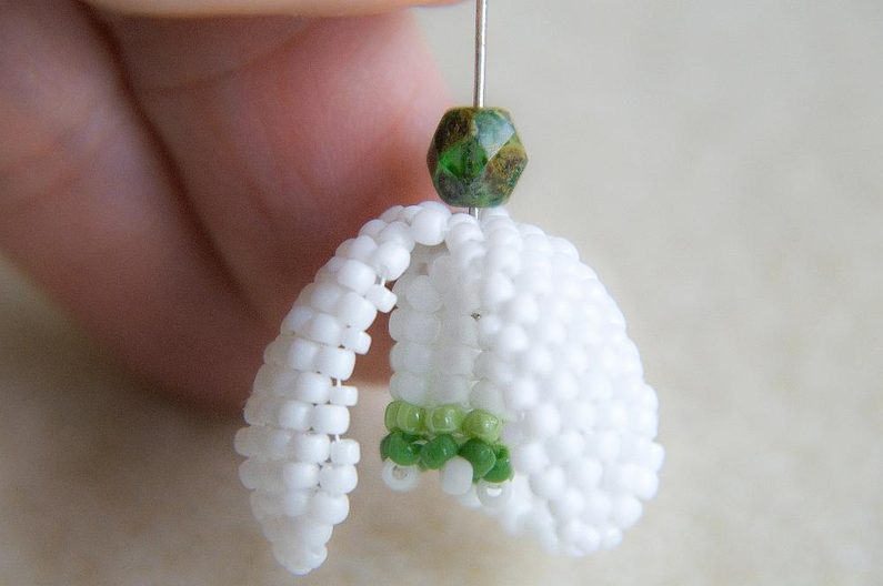 Pro zpevnění prošijeme ještě jednou dokola druhé korálky obou lístků a přidaný korálek.