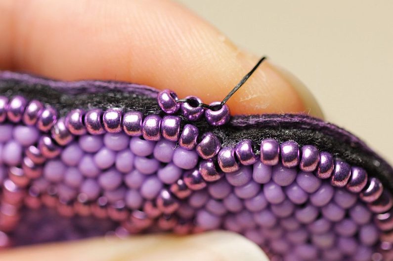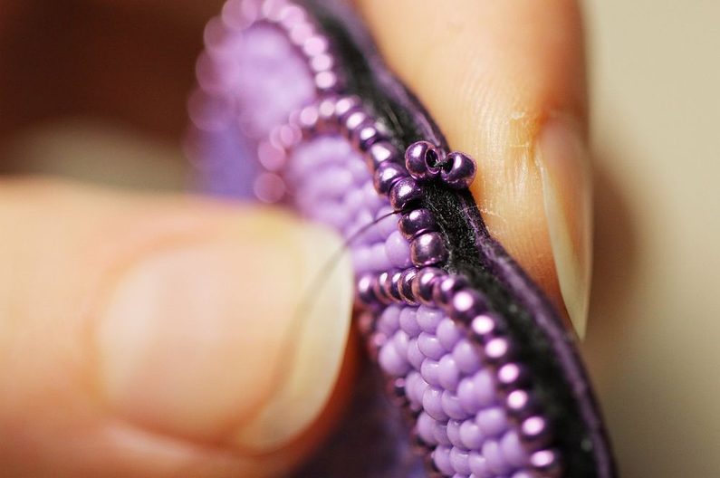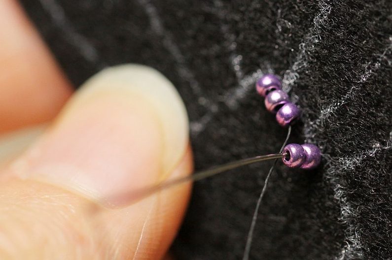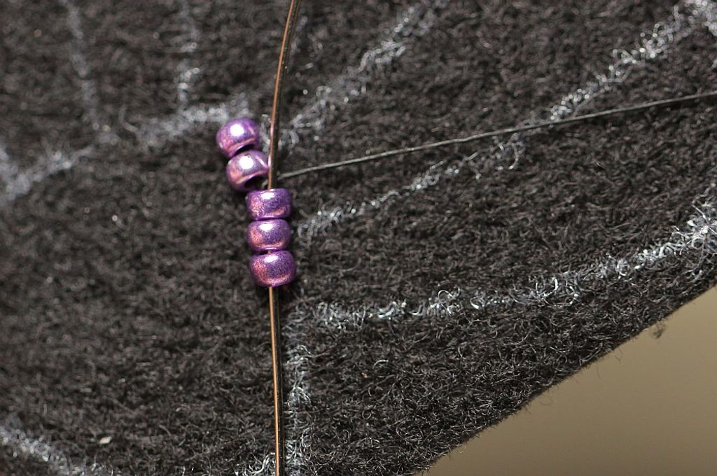 Začneme podšívat. Jehla nám vychází na lícu, navlékneme na ni 2x PR10, jehlu zapíchneme z rubové strany, aby opět vycházela na straně lícové. Nyní ji protáhneme druhým z obou našitých korálků a utáhneme.