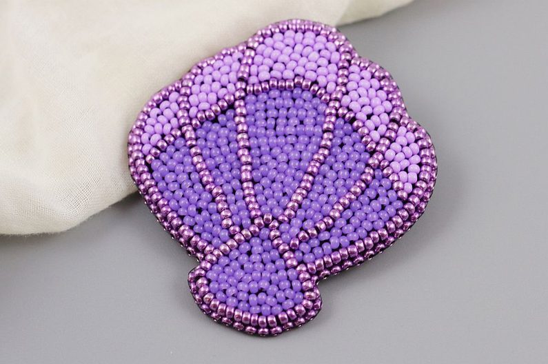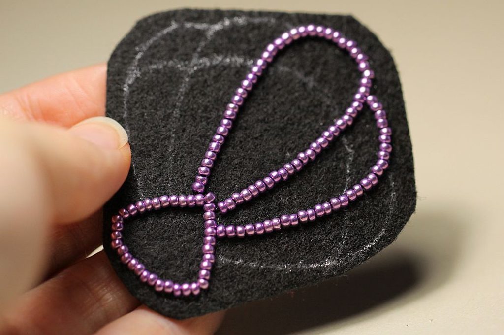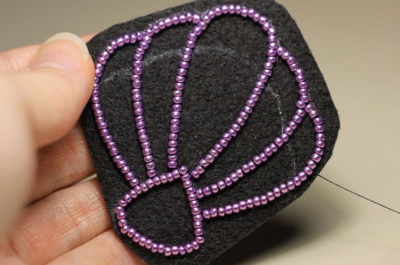 Začneme výšivkou vyplňovat vnitřek mušle. Našíváme vždy jeden PR10 tak, aby pokud možno nevznikaly mezery, kterými by prosvítal podklad.