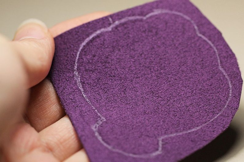 Podle šablony si nakreslíme a vystřihneme obrys semišového podkladu. Umístíme na něj brožový můstek, který lehce přilepíme, necháme zaschnout a poté ještě přišijeme.