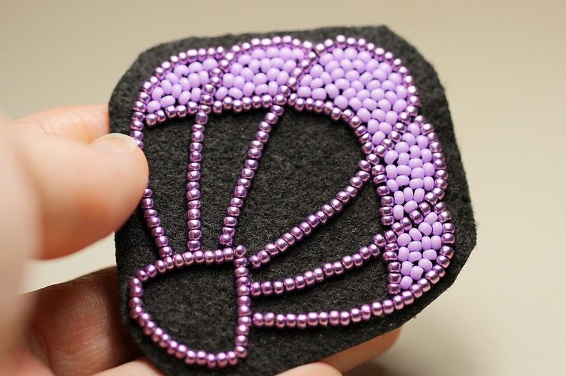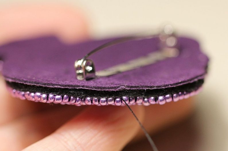 Navlékneme další korálek PR10 a našijeme jej vedle těch dvou minulých. Upevníme jej stejně jako v přechozím kroku prošitím. Opakujeme po celém obvodu, až máme brož hotovou. :)