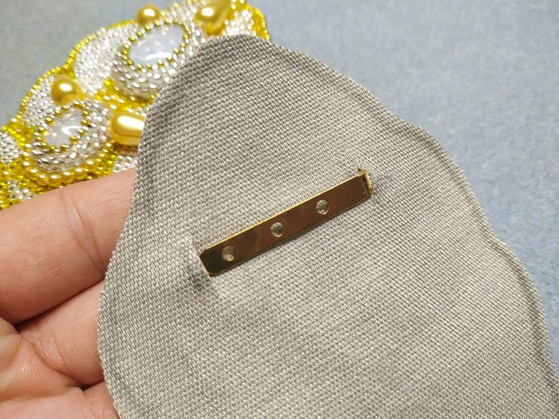 Jako podklad , ke kterému zároveň přišíváme brožový můstek ( který by měl být v tomto případě co největší aby se brož nepřeklápěla) můžeme použít buď filc, nebo například textilní koženku ( i kůži). Vyšítý díl si obkreslíme na rubovou část a vystřihneme okolo s přidáním na okraji zhruba 1,5 mm.