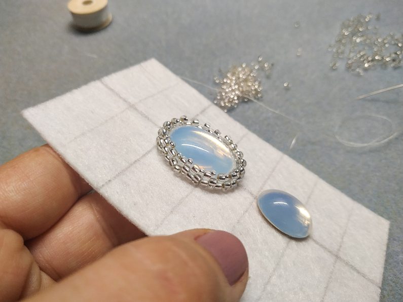 Postup opakujeme až do ukončení, kde poslední a první korálek prošijeme zároveň. Je nutné vyšít sudý počet korálků, jinak nám obšívání kabošonu v další řadě nevyjde na potřebný počet korálků.
