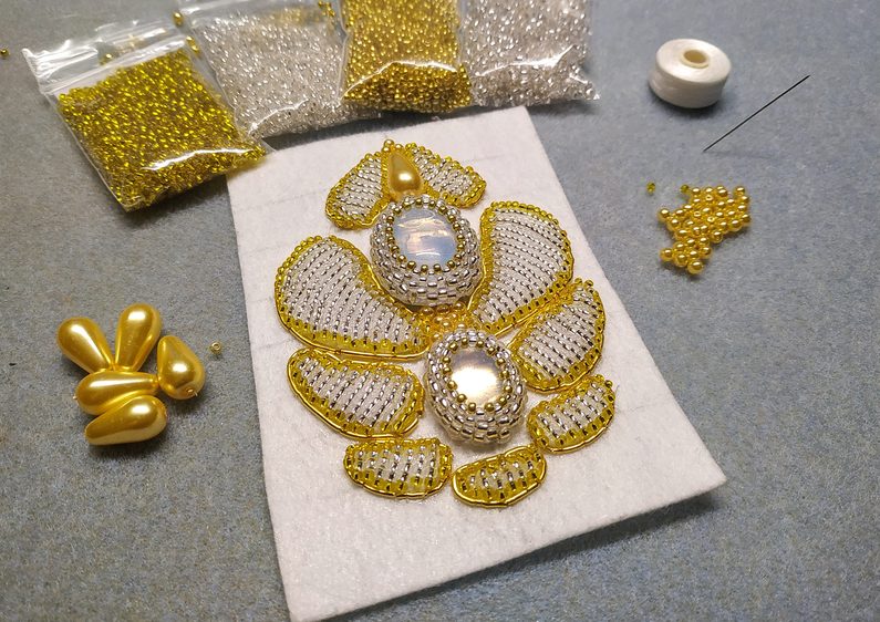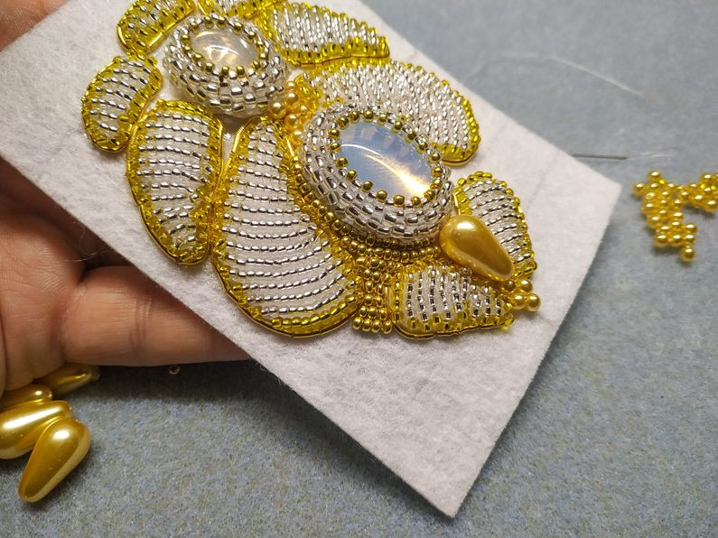 Nyní začneme stínovat plastické části, použila jsem bílou a žloutou variantu se stříbrným průtahem TR10 z výrobního programu Preciosa. Vyšívat začínám vždy z nejužší strany. Po okrajích navlékám žlutý korálek středový prostor vylňuji bílým. Vyšíváme na plocho/křížem přes podlouhlý tvar. Pomalu, někdy je třeba si každou řadu pěkně vyměřit na počet korálků. Jednotlivé řady fixujeme zapošitím křížem přes řadu. Je potřeba vše utáhnout jakoby zvolna tak, aby se nám výšivka nekrabatila.