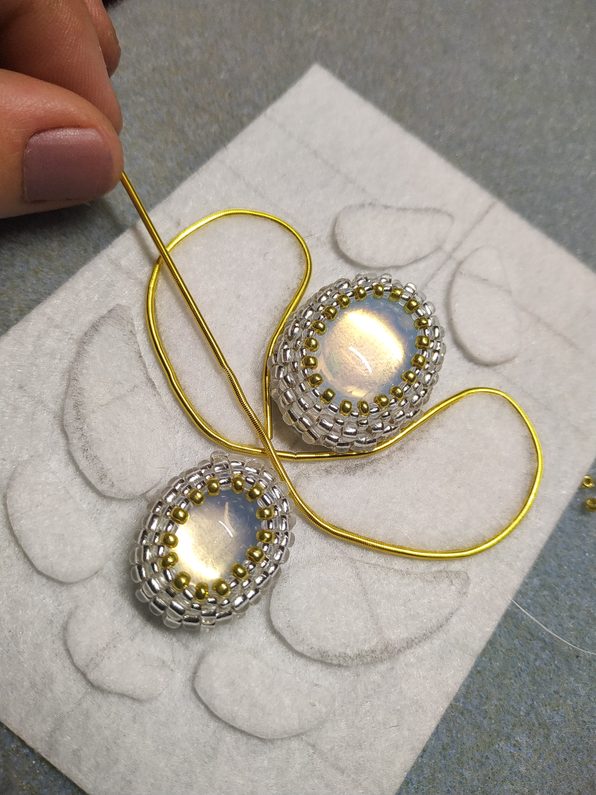 Ve 3. řadě si korálky z předchozí řady pěkně urovnáme, utáhneme, aby „neplandaly“, a navlékáme opět po jednom korálku, kterým vyplňujeme mezery. Ve 4. řadě postup opakujeme ale použijeme metalickou zlatou barvu korálků. Po obšití kabošonu protáhneme šikmo řadami nit dolů a zapošijeme k podkladu těsně u kabošonu . Stejný postup opakujeme u druhého kabošonu.