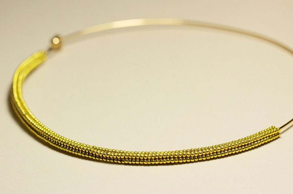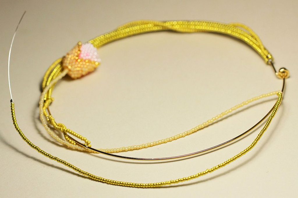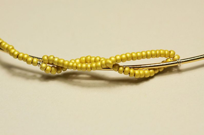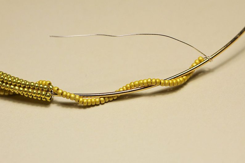Dutinku šijeme do poloviny obruče, pak nymo zapošijeme. Uštípneme si drát o délce přibližně 50-60 cm a jeden jeho konec protáhneme jedním z krajních korálků blízko zapínání obruče. Konec drátu omotáme kolem obruče a pojistíme kapkou lepidla. Na drát začneme navlékat korálky PR10 a takto navlečený drát omotáváme okolo šité dutinky.