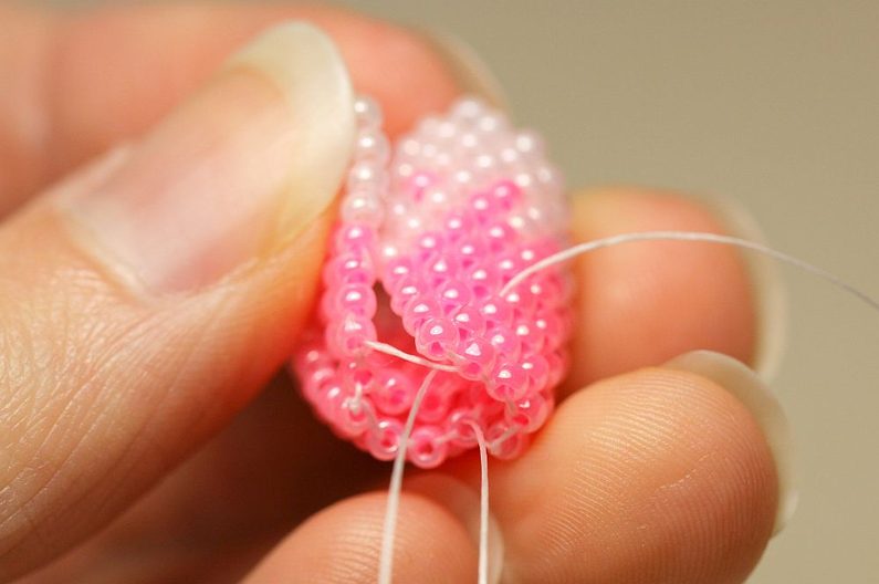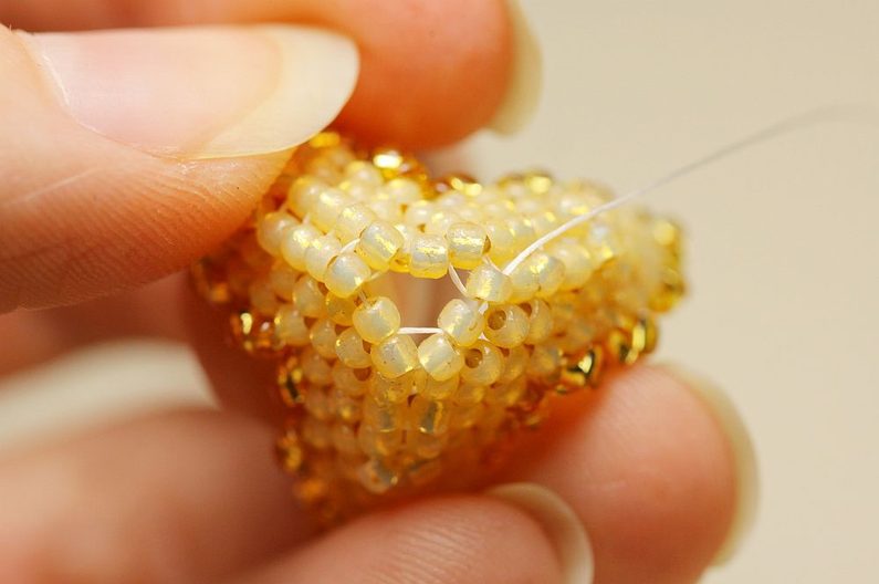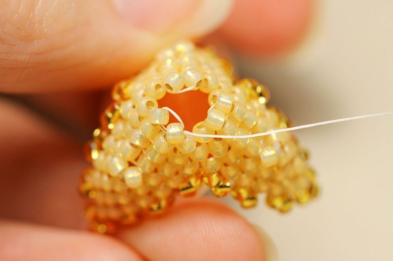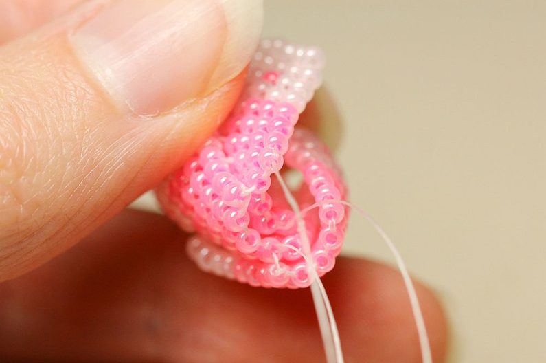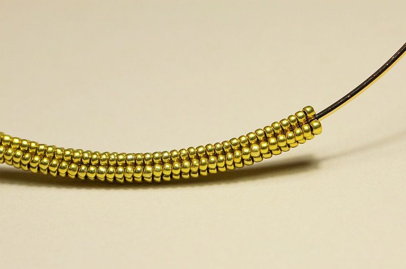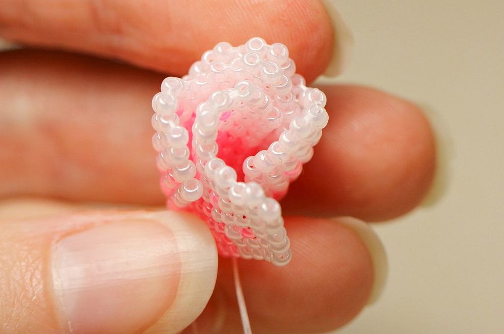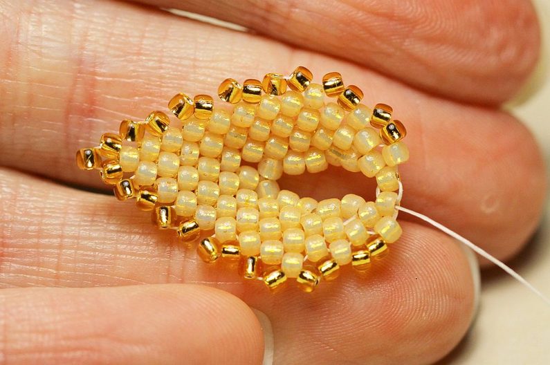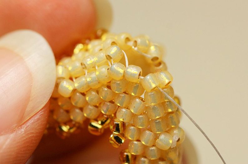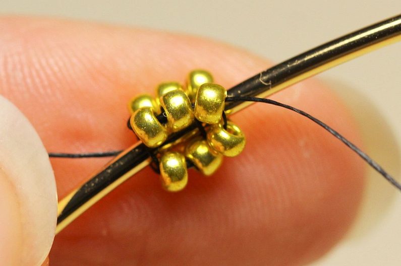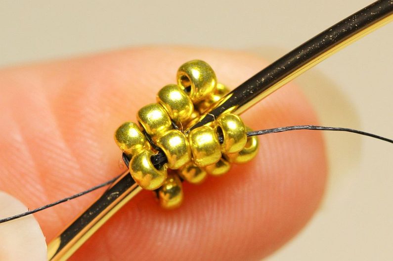 Nyní budeme navlékat vždy 2x PR10 a protahovat jehlu dvěma posledními korálky ve sloupečku a dalšími dvěma ve stejné úrovni (ale vedle) se vracet zpátky. Takto se nám kolem obruče bude tvořit krásná hladká dutinka.