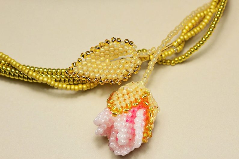List našijeme na místo, kde máme omotaný drát okolo dutinky, čímž nevzhledné místo zakryjeme. Od lístku přidáme pár TR11 jako pokračování řapíku až ke stonku růžičky. A náhrdelník máme hotový. :)