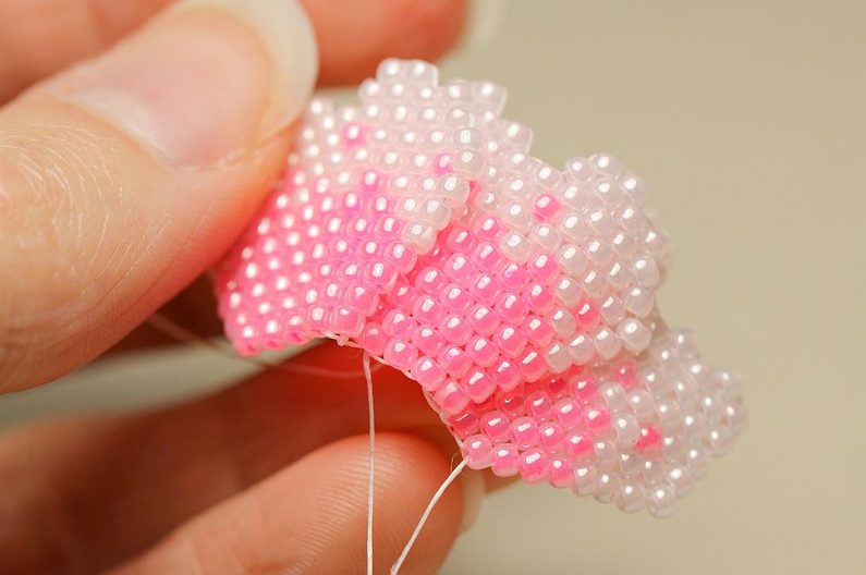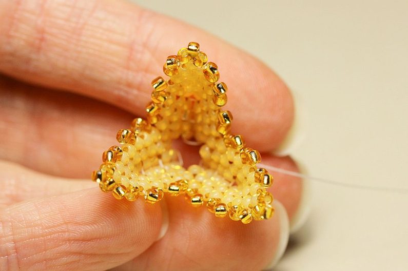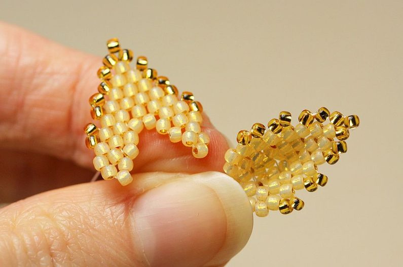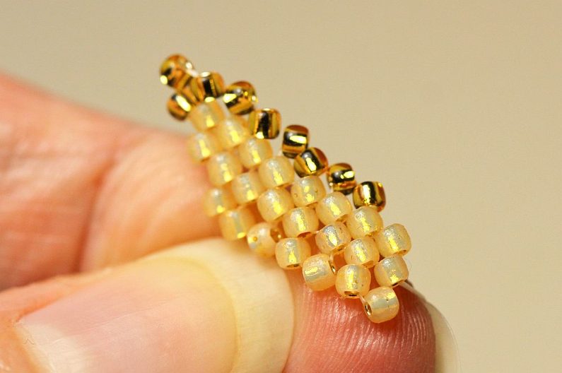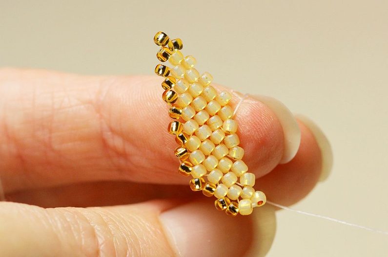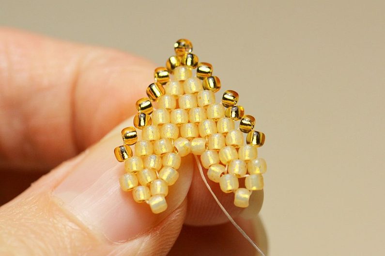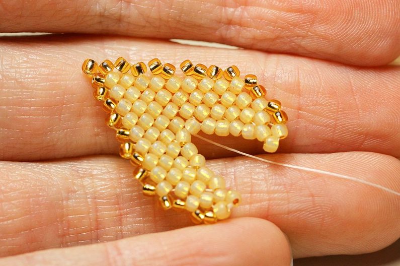Jehlu vedeme prvními dvěma vnitřními korálky na jedné straně a druhým jedním korálkem na druhé straně v opačném směru. A opět protáhneme jehlu dvěma korálky na první straně (2. a 3.) a jedním ve zpětném směru na druhé straně. Takto pokračujeme, až sešijeme vnitřek listu k sobě.
