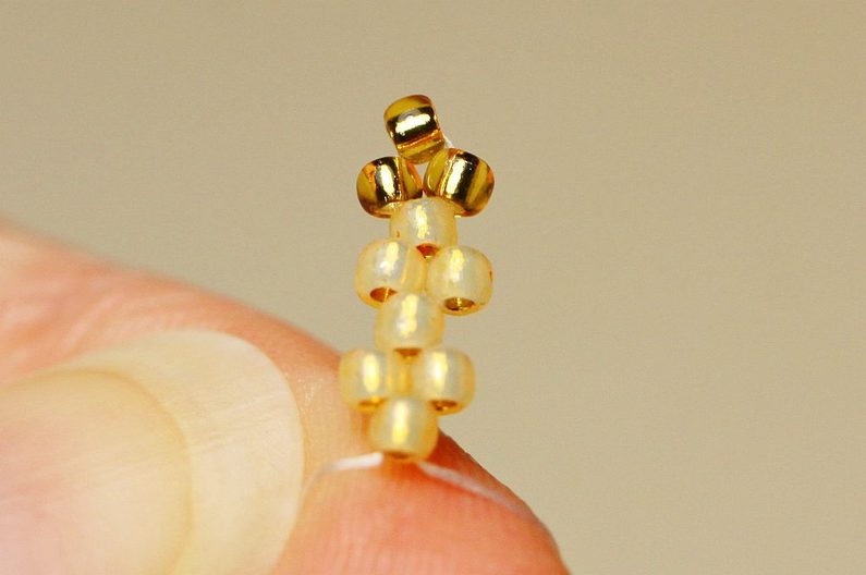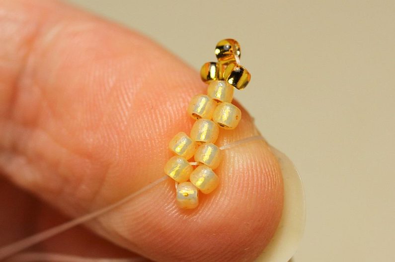 Začneme pracovat na listech, které bude mít poupátko okolo sebe, takový lístečkový kaplík. Na nové nymo navlékneme 8x TR11 (5+3 jiné barvy) a jehlu píchneme do prvního korálku jiné barvy, aby nám vznikla pikotka. Dále došijeme peyotem a uděláme dva uzlíky na upevnění.
