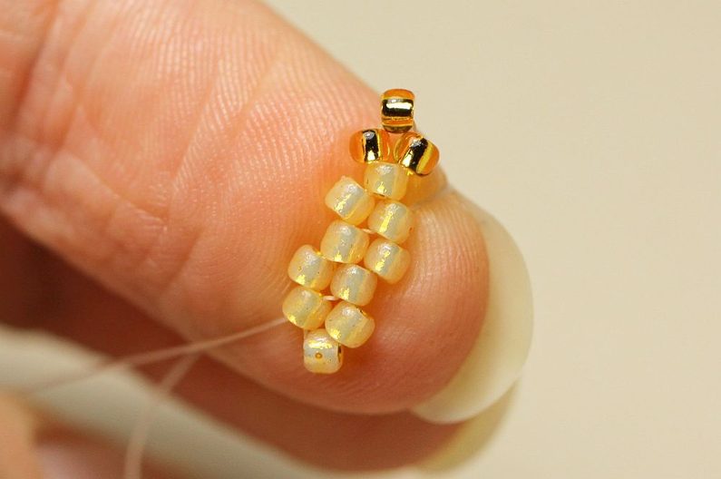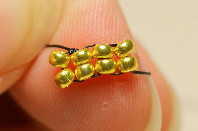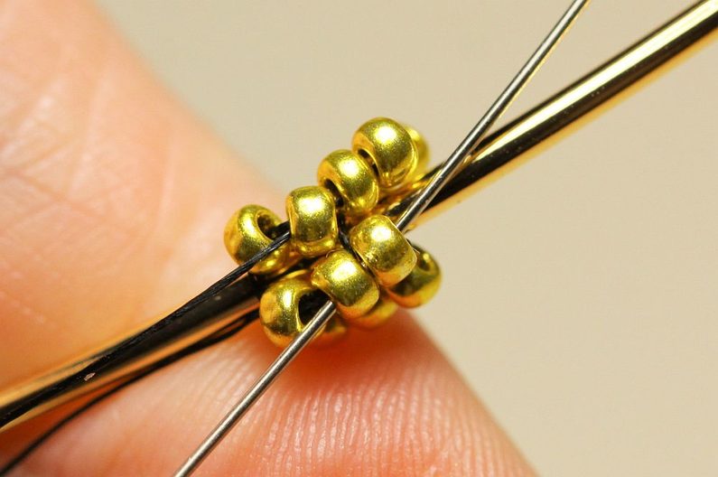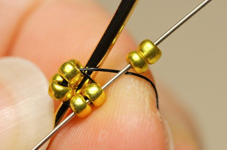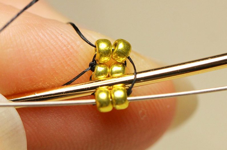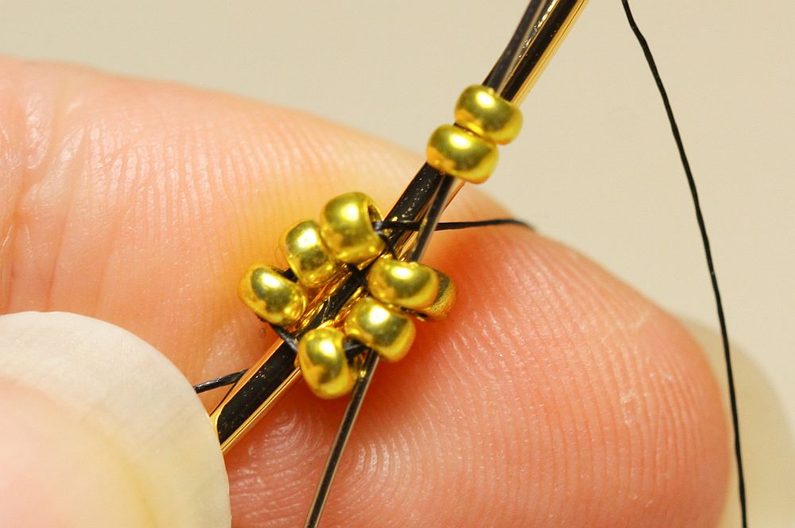 Ustřihneme si nymo, navlékneme na něj jehlu a 4x PR10, které spojíme uzlíkem do kroužku. Navlékneme další 2x PR10 a jehlu protáhneme tak, jak vidíme na fotce. Opakujeme ještě jednou, abychom měli 4 sloupečky a 2 řady korálků.