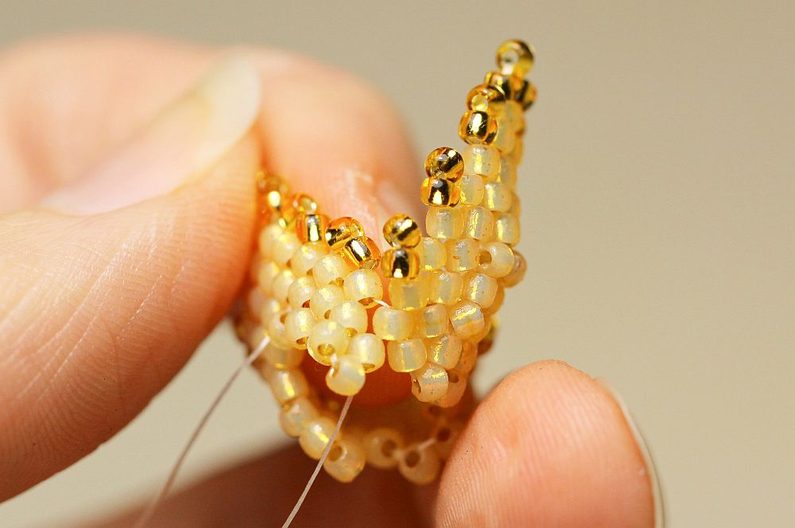 Nyní potřebujeme z lístků utvořit poupě, takže je musíme šikovně sešít k sobě. U jednoho listu nám nymo vychází z prvního spodního korálku, jehlu s tímto nymem píchneme do druhého spodního korálku (počítáno odzadu) jiného listu. Jehlu protáhneme celkem pěti korálky za sebou tak, aby ten pátý byl ve stejné úrovni (sloupečku) jako první. Teď jehlu vedeme krajním korálkem v páté řadě druhého listu.
