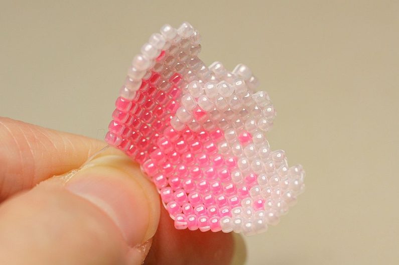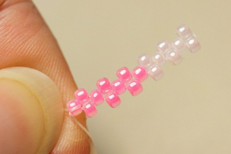 Na nové nymo navlékneme 13x TR11, pořadí barev dle fotografie. Jehlu píchneme do třetího korálku od konce a přidáváme vždy 1x TR11 ob jeden korálek z prvního návleku. Na konci si můžeme oba dva konci svázat dvěma uzlíky, aby nám začátek okvětního plátku dobře držel.