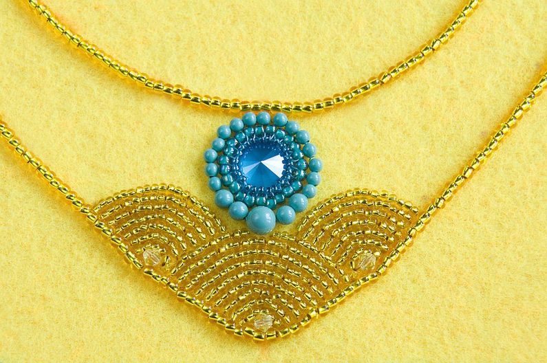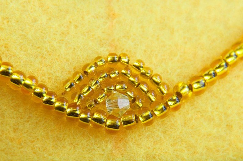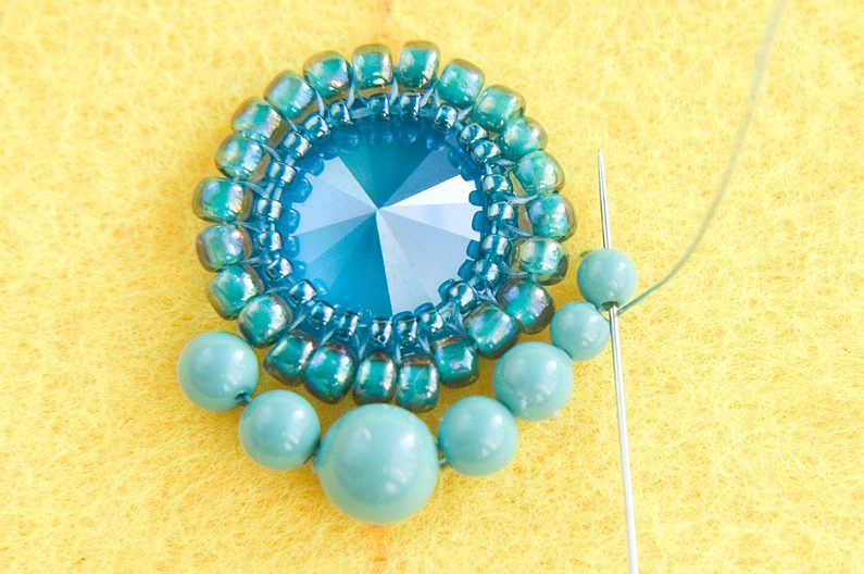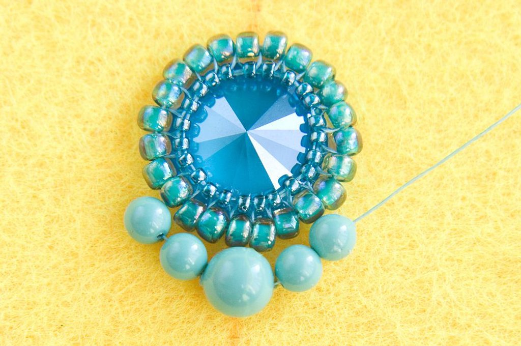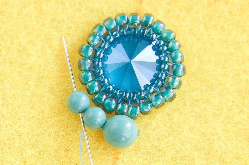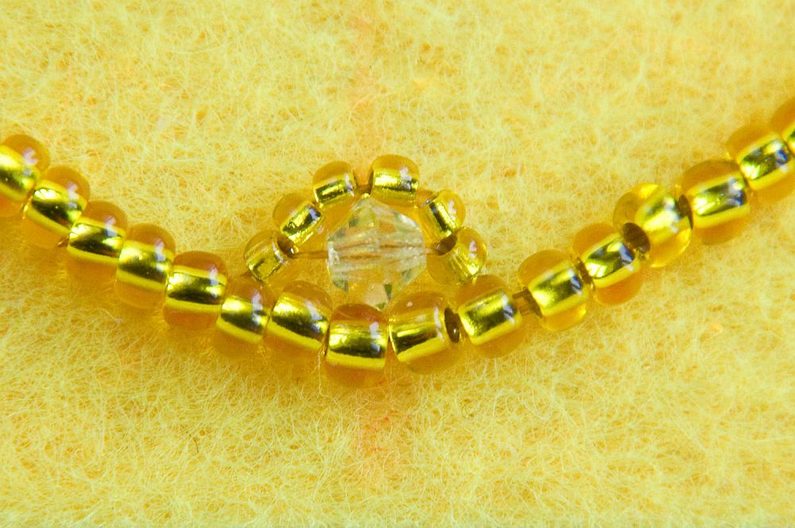 Nyní budeme vyšívat kolem základního prvku obloučky. Můžete postupovat stejně jako u vyšívání obvodu náhrdelníku, tj. přidávat vždy dva PR11, nebo si maličko urychlit výšivku přidáváním tří korálků.