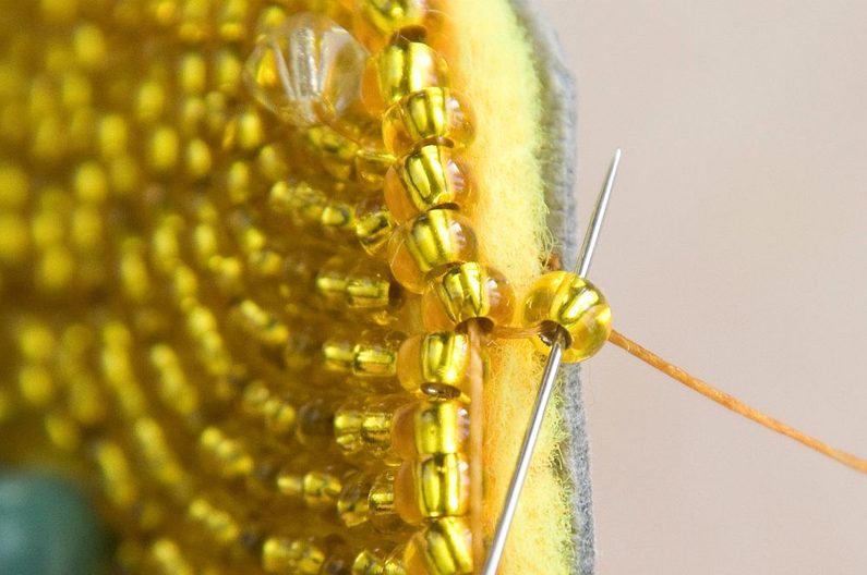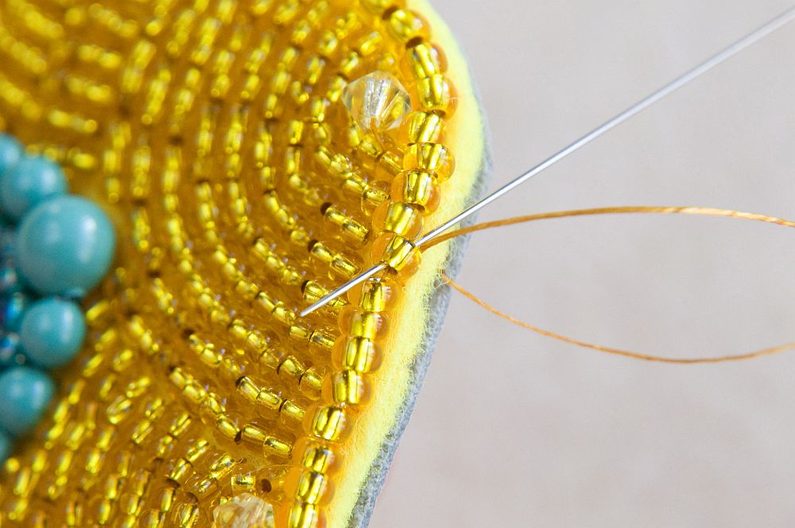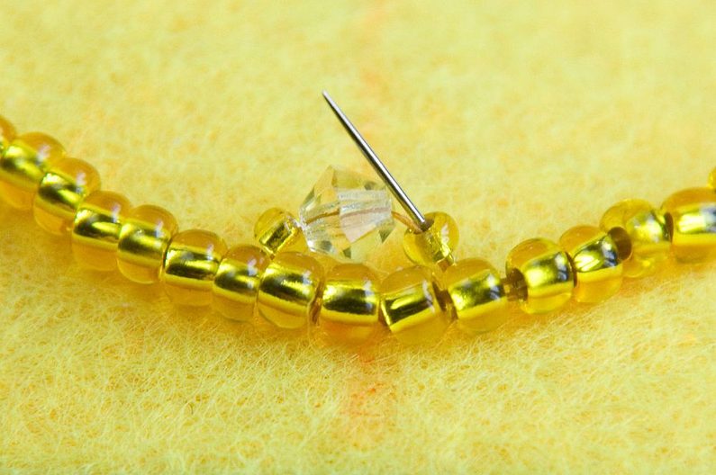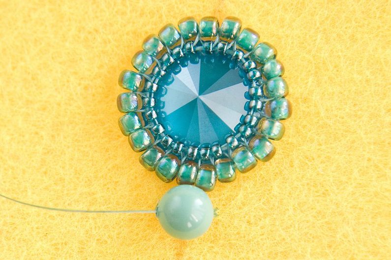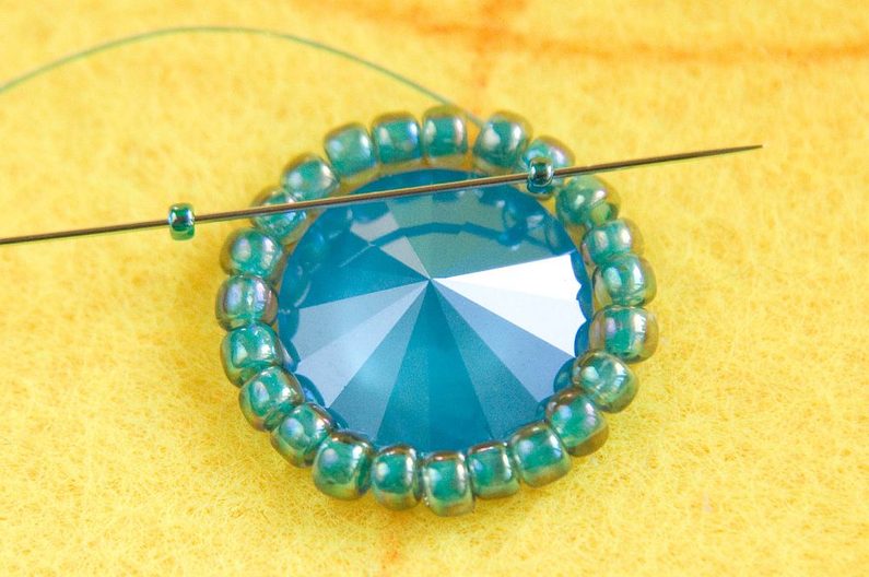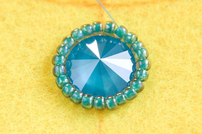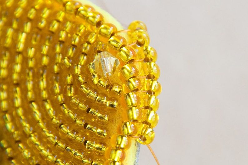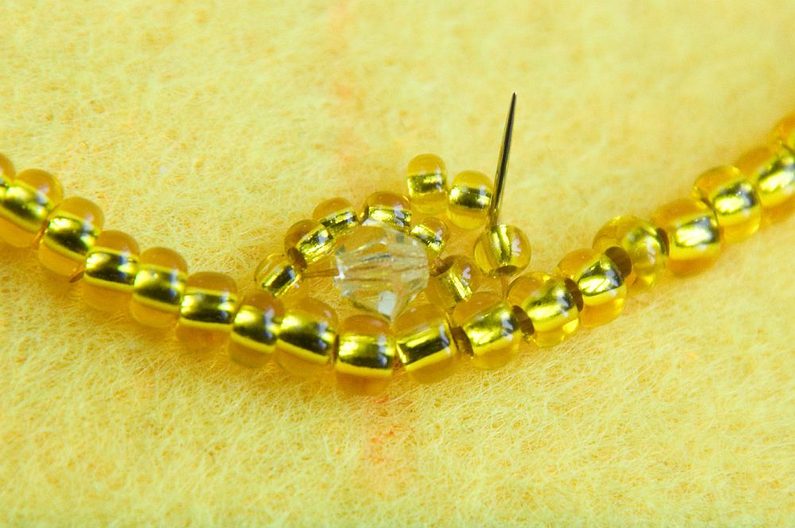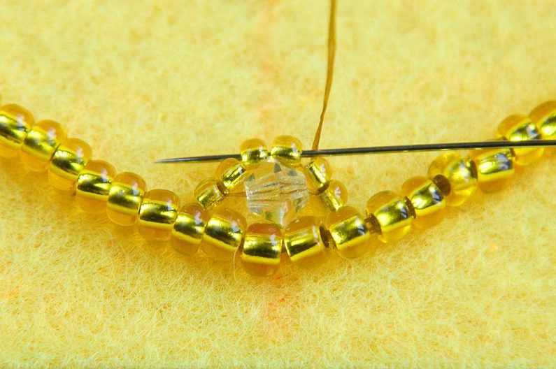 Opakujeme tento krok kolem celého obvodu. Na konci řady prošijeme první z přidaných korálků shora dolů, ale neprošijeme podklad (Obr. 59)