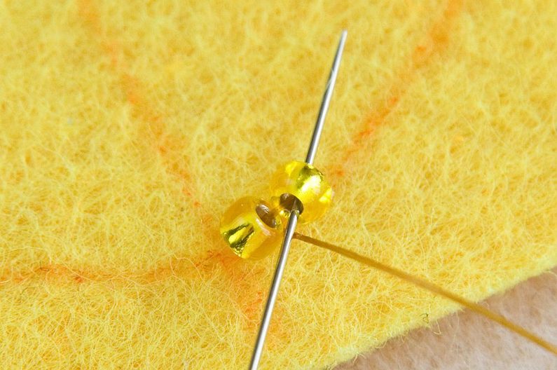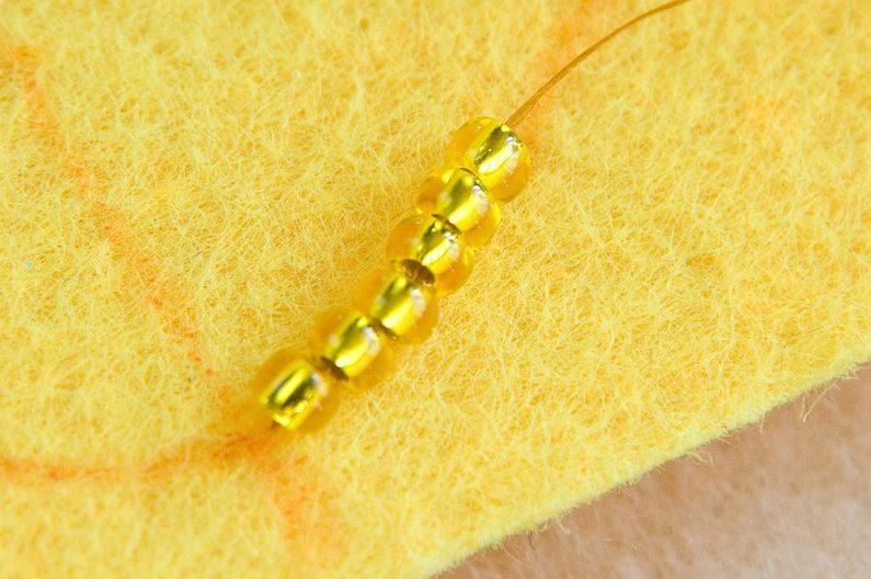 Prošijeme zespodu podklad i filc kousek za naposledy prošitý korálek (Obr. 60)
