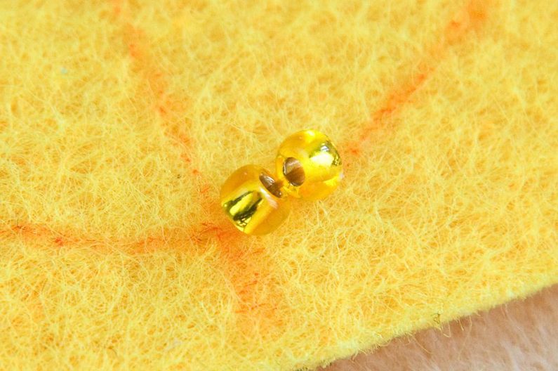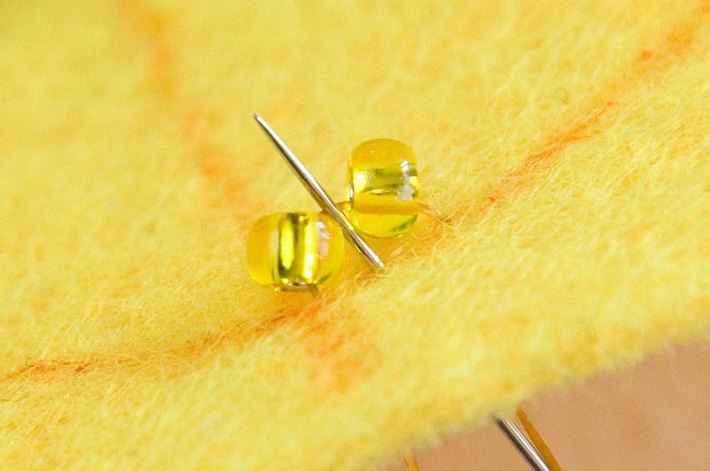 Navlékneme 1x PR8 a prošijeme zespodu podklad i filc cca 5mm od kraje a ve vzdálenosti cca na výšku korálku od předchozího vpichu, prošijeme se v místě, kde je z lícové strany následující neprošitý korálek (Obr. 46)