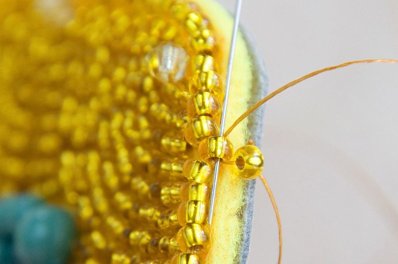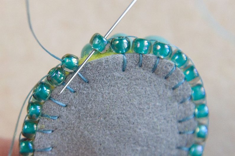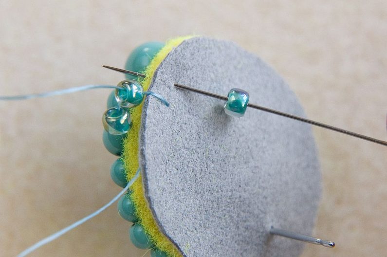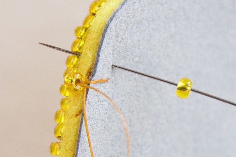 Nyní už můžeme ušít celý zbytek obvodu obšité rivolky. Navlékneme 2x SP3 a prošijeme filc dolů na šířku přidaných perliček (Obr. 21)