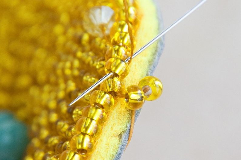 Začneme vyplňovat plochu náhrdelníku výšivkou. Navlékneme si novou nit (nebo pokračujeme, pokud máme ještě dost dlouhou). Prošijeme se zespodu filcu těsně u korálkové hranice co nejvíce vycentrovaně v dolním středu.
