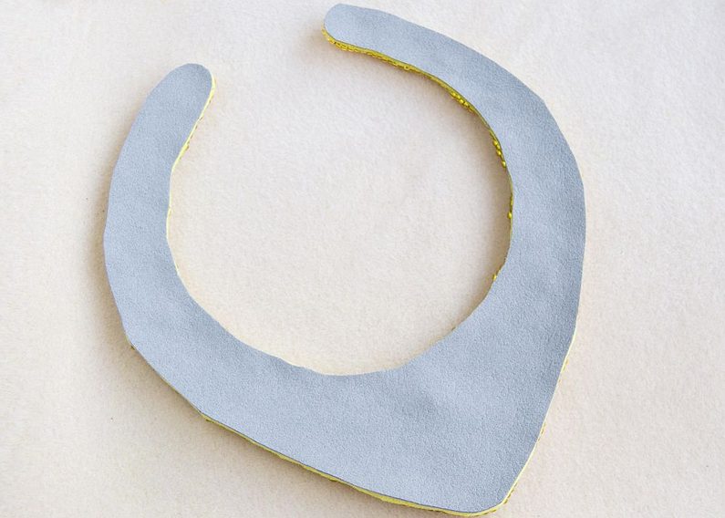 Vystřižený náhrdelník nalepíme na podklad (Ultrasuede a podobně), kterým zakryjeme nitě z rubové strany, a opět vystřihneme. V případě, že je stříhání oblých tvarů s rovnými nůžkami obtížné, použijte jednoduše zaoblené manikurní nůžtičky (Obr. 41)