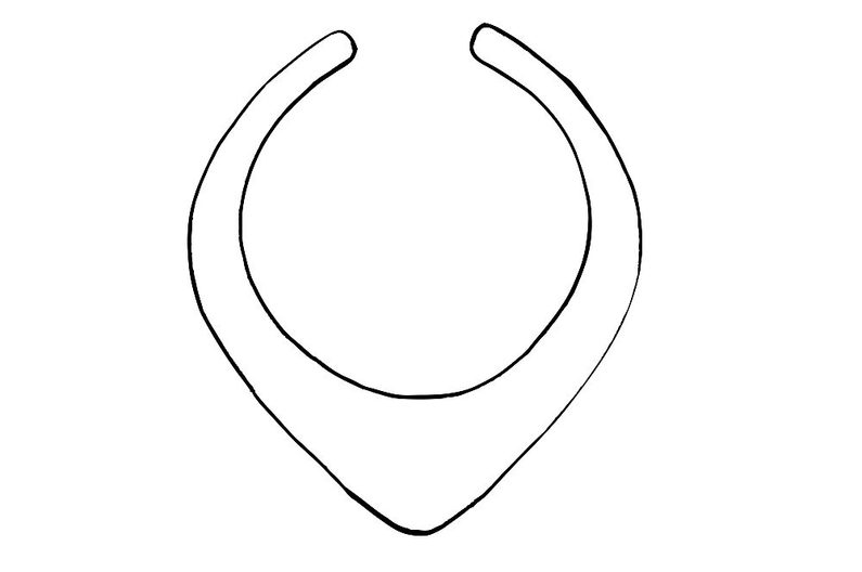 Načtrtnutou šablonu na náhrdelník najdete na obrázku, můžete si ale vyrobit šablony podle vlastní fantazie. Vnitřní průměr tohoto náhrdelníku je 12,5cm (nosí se těsně u krku), šířku si opět můžete upravit dle potřeby. Tiskněte na pevnější papír vel. A4 a vystřihněte (Obr. 2)