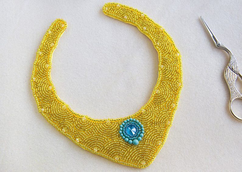 Vyšitý náhrdelník opatrně vystřihneme, kontrolujeme si nitě z rubové strany výšivky. Pokud se stane, že nějakou nit přestřihnete, jednoduše si navažte nit a uvolněné korálky znovu přišijte (Obr. 40)