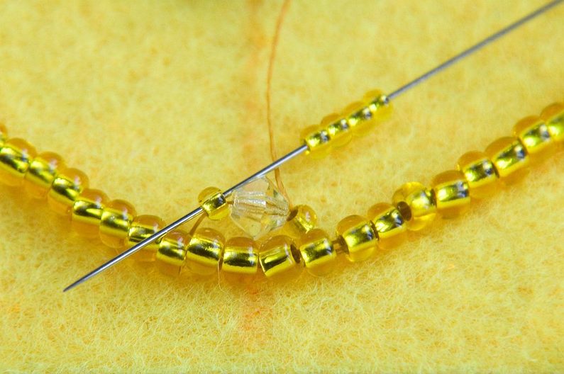 Prošijeme shora dolů vedlejší korálek, abychom se dostali k druhému konci nitě (Obr. 62)