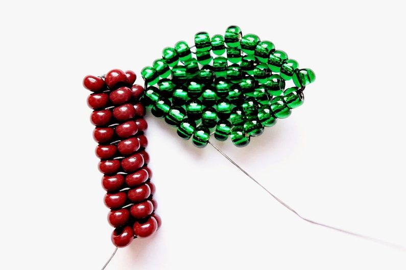Nití sjedeme pod druhý PR10 shora a začneme šít lísteček: