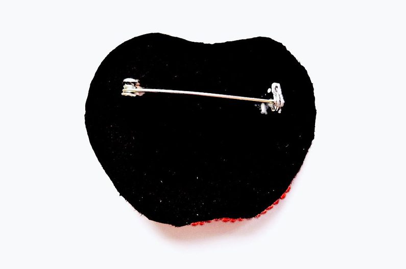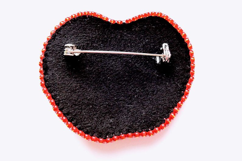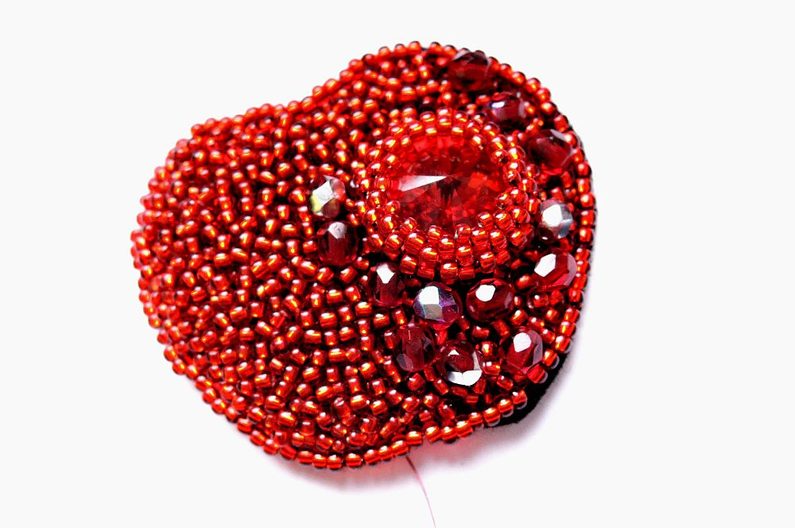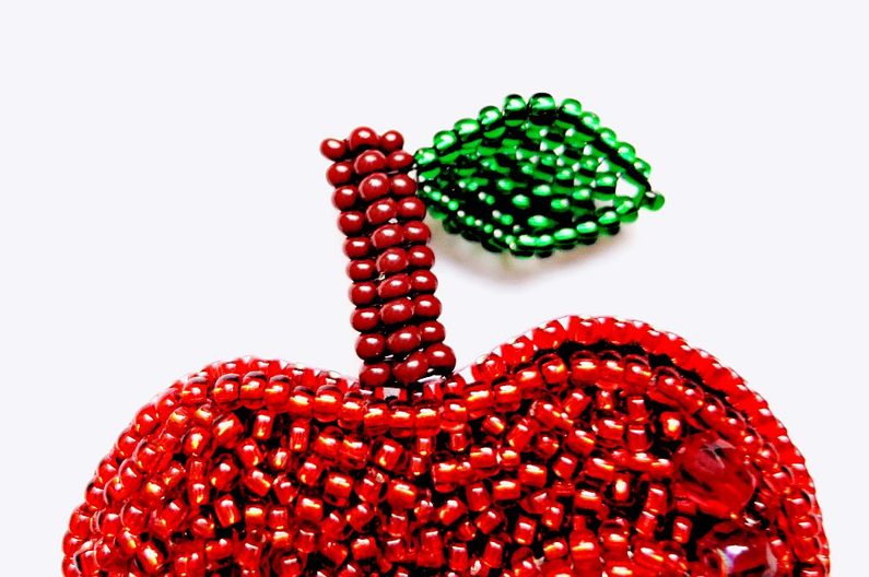 Vystřihněte si tvar jablíčka o rozměru cca 5x4 cm. Až do kroku č. 6 postupujte stejně jako u spony. Výšivku proveďte PR10č a TR15. Můžete zakomponovat i broušené korálky (obr. 1).