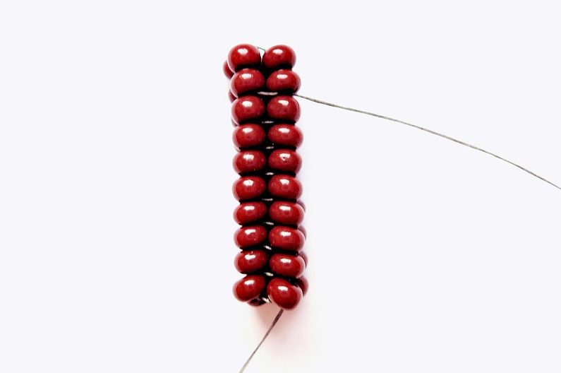 Nyní si sešijte obě řady dvojic korálků k sobě, aby se nerozevíraly – prošijete dvakrát čtyři korálky z obou dvojic , totéž zopakujte i na druhé straně (obr. 12).