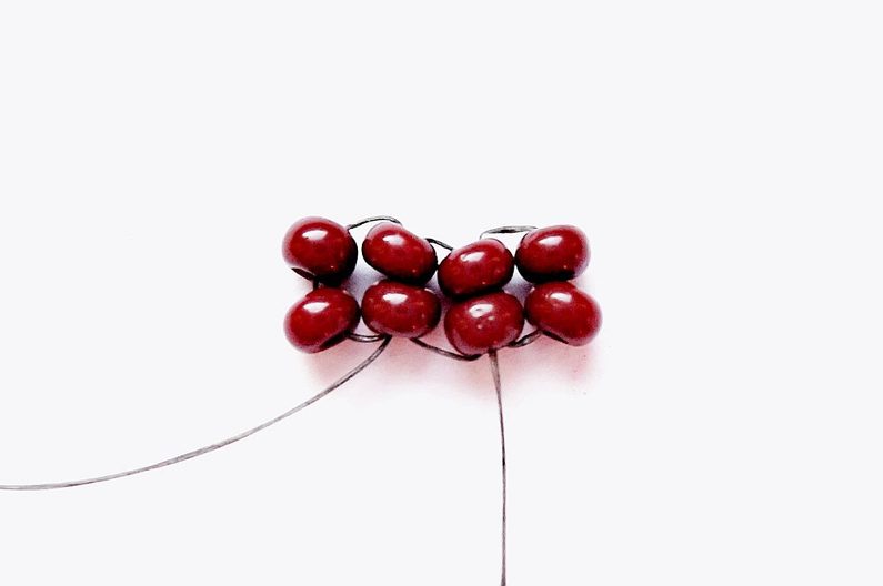 Přistoupíme k ušití stopky stehem herringbone (rybí steh) korálky PR10h: Na Fireline dlouhou cca 90 cm navlékněte jehlu a 4 PR10h. Prošijte dvojici PR10h tak, aby vznikl čtvereček (obr. 4), na jedné straně nechte pouze kousek Fireline na zapošití a pokračujte druhou stranou. Vaše práce nyní představuje dvě dvojice rokajlů vedle sebe, kdy kratší část Fireline vychází ze spodní strany a delší část z horní strany. Přidejte další 2 PR10h, prošijte tak, aby se zařadily vedle prvních dvou dvojic (obr. 5). Vzápětí si právě přidanou dvojici opět prošijte směrem dolů tak, aby oba kusy Fireline vycházely ze spodní strany. Navlékněte poslední 2 PR10h základu a prošijte si shora dolů druhou dvojici PR10h. Vznikne nám čtvrtá dvojice (obr. 6). Tu prošijte zespodu nahoru (obr. 7).