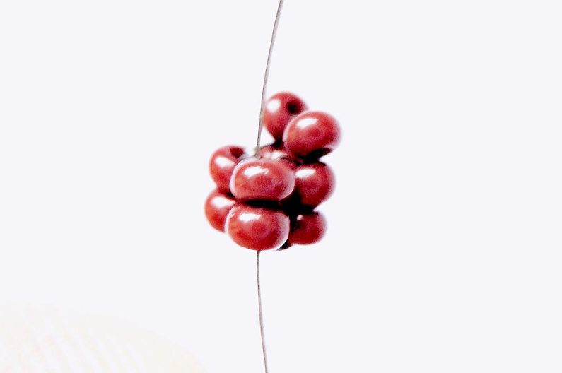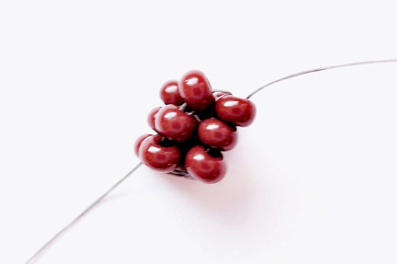 Prošijeme nití do spodku jablíčka a ušijeme „bubáka“ z hnědého broušeného korálku a jednoho PR10h. Zapošijeme zbytek Fireline, ustřihneme a máme hotovo (obr. 20).