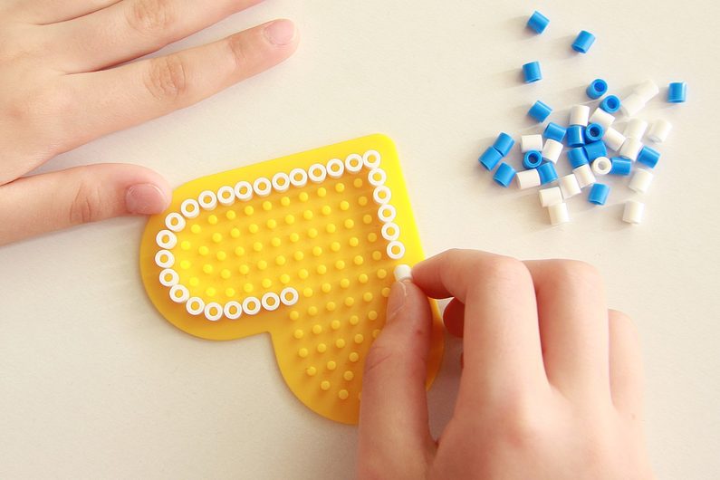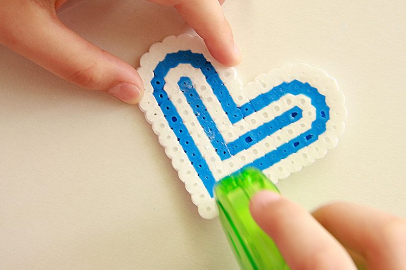 Celé srdíčko tvoříme od okraje směrem ke středu. Nejprve si z bílých korálků vytvoříme okraj srdíčka. Další řadu tvoříme z modrých korálků, a tak budeme postupovat až k středy podložky.