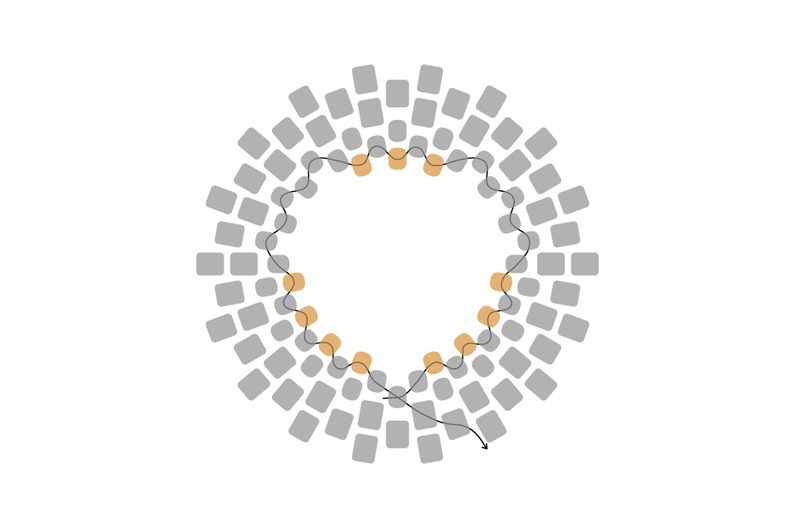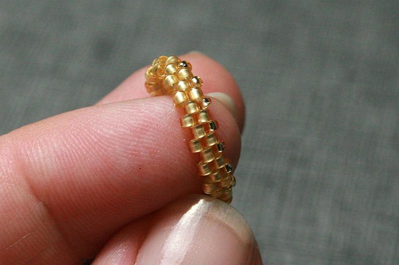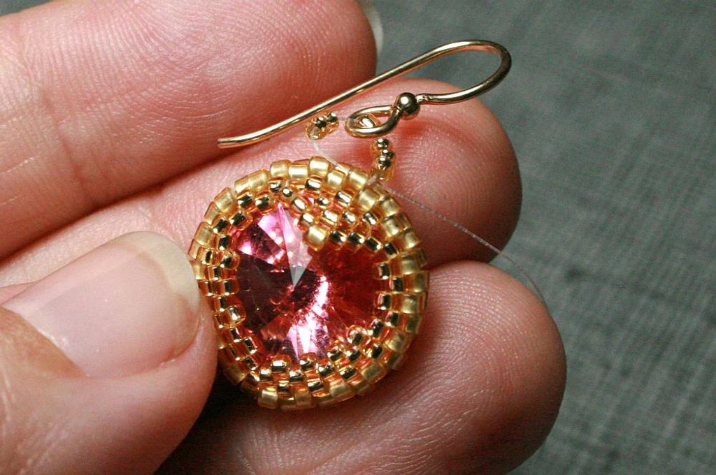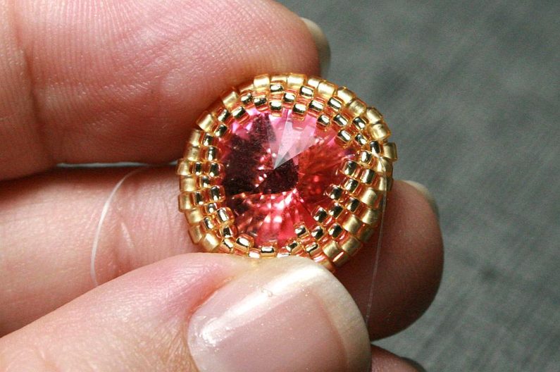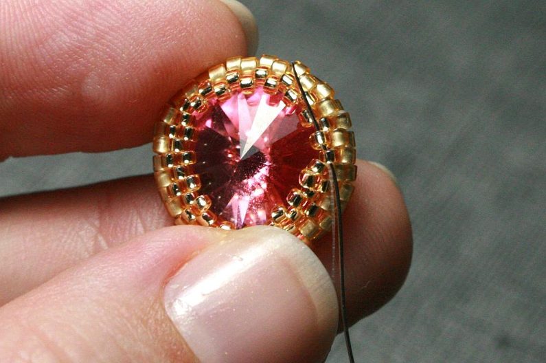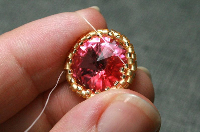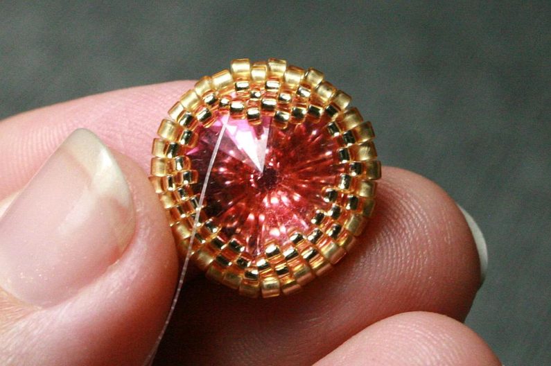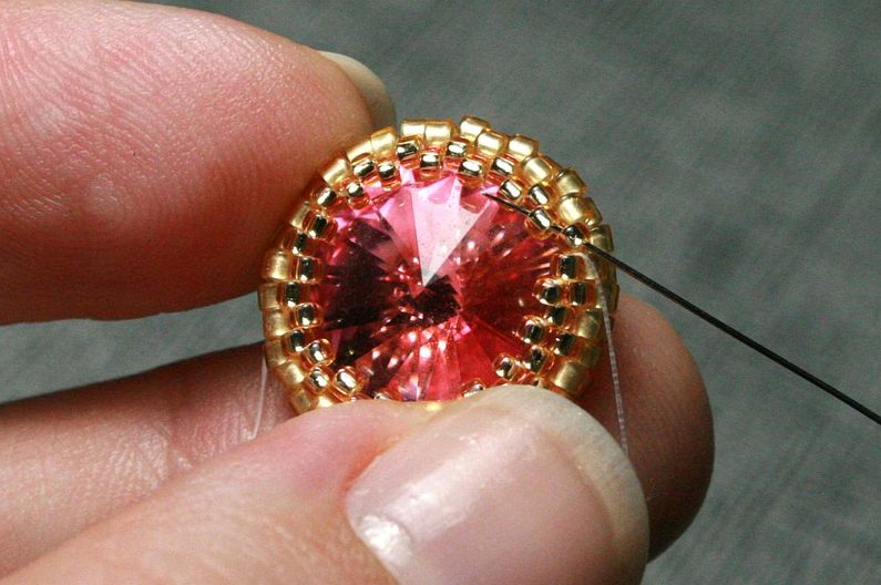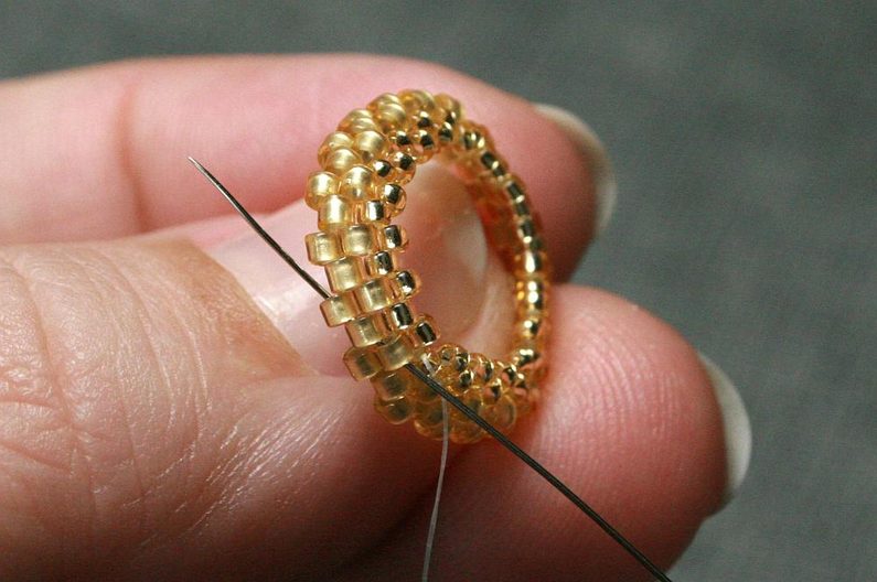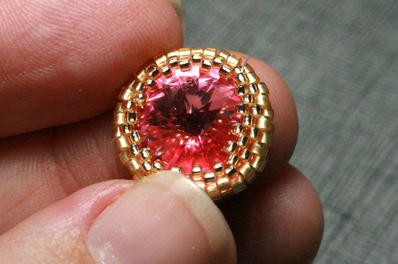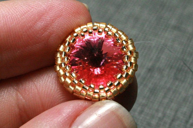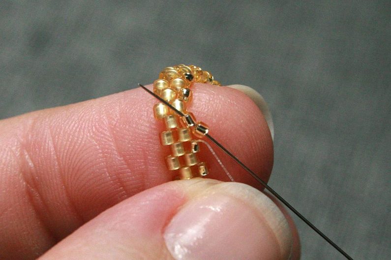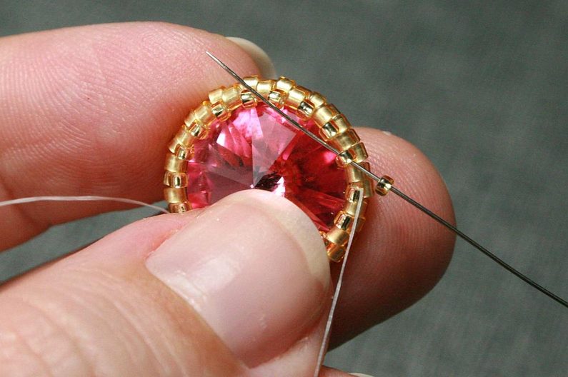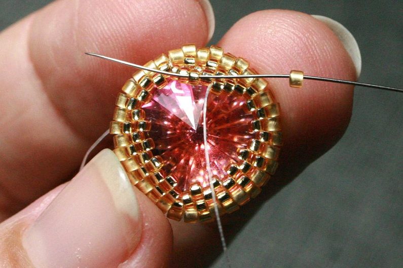 Uděláme přechod do další řady, to znamená, že prošijete poslední rokajl z původní řady a zároveň projdeme prvním z nové řady (Obr. 9). Dále navléknete TR15, vynecháte jeden rokajl a vpíchnete do třetího (jako jsme dělali v předchozím kroku). Všíváte po jednom TR15, po celém obvodu. (Obr. 10-12)