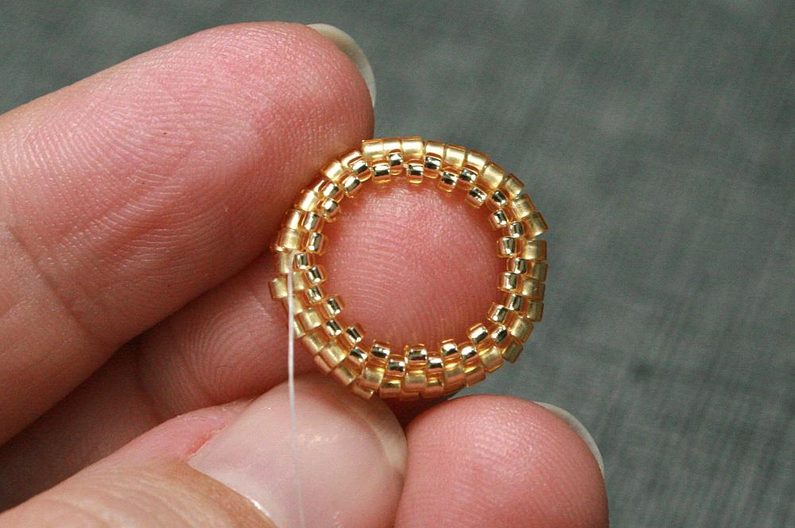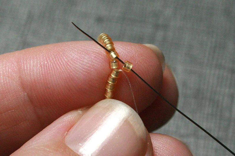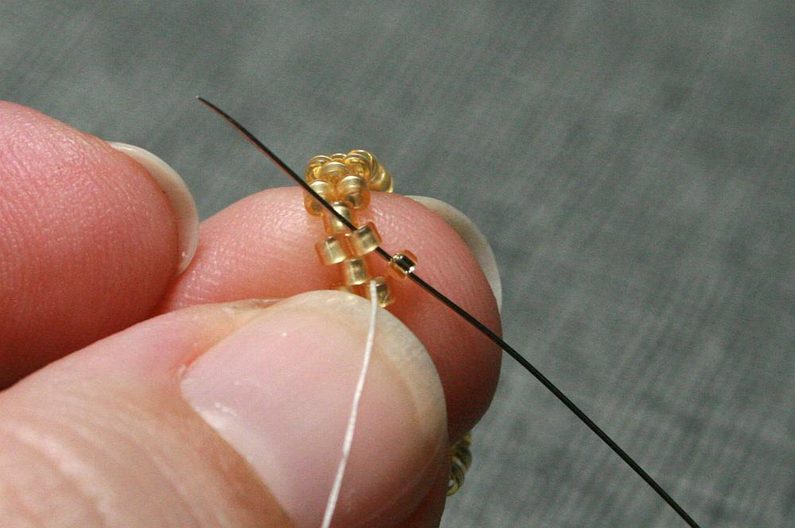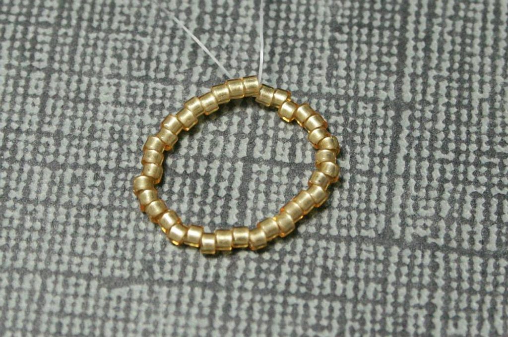 Ustřihněte si cca 1m Fireline. Navlékněte si jehlu a pak 36 ks TT12. Svážeme dvojitým uzlíkem.