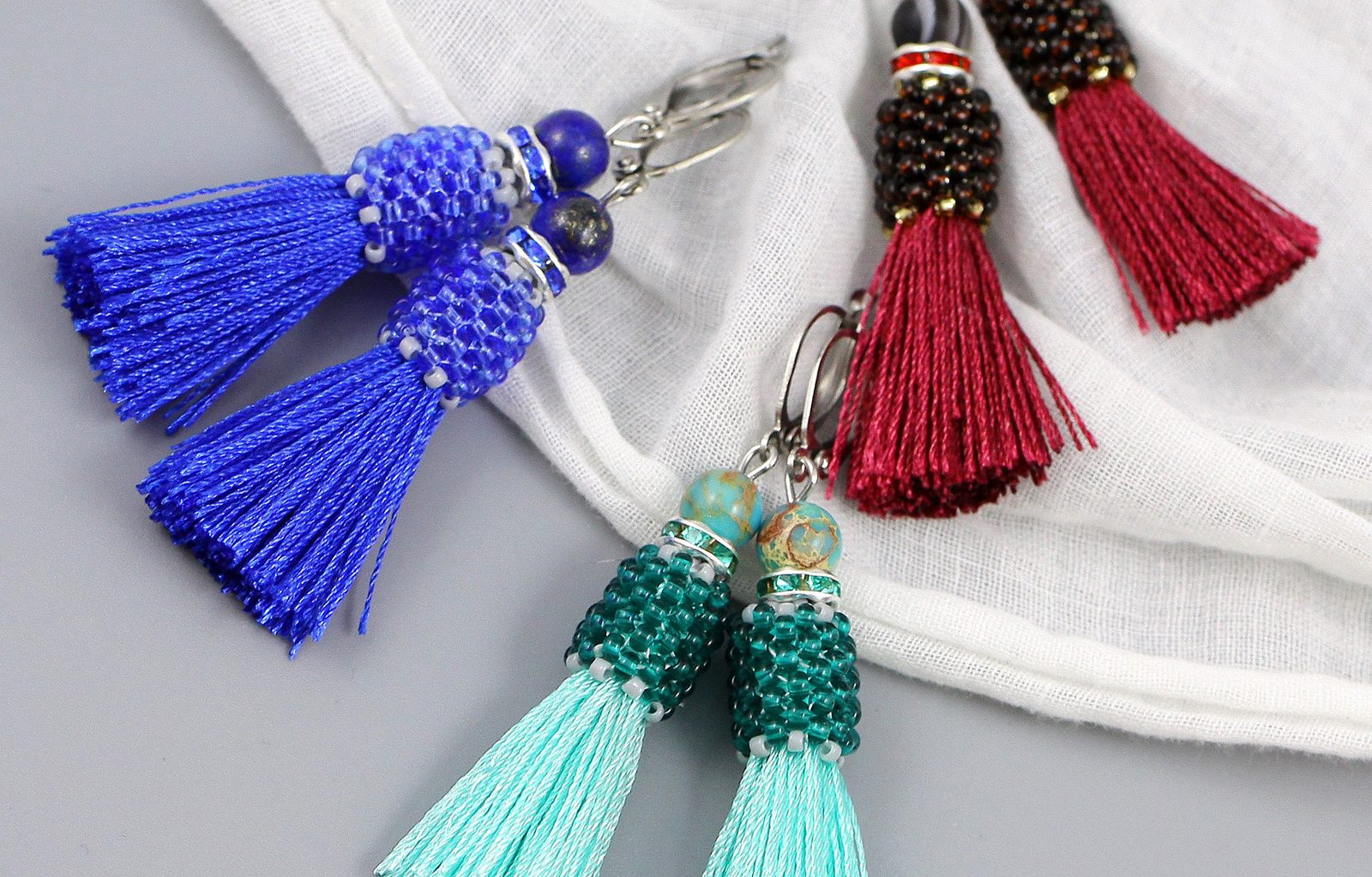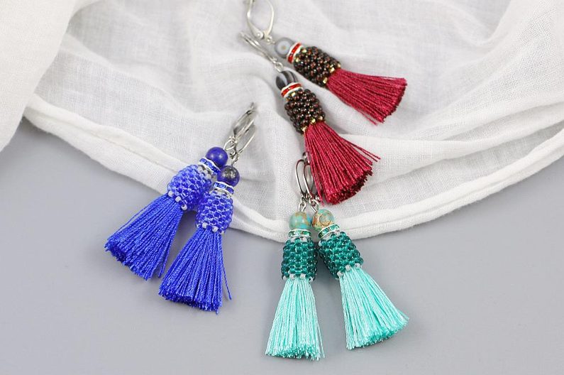 Opakujeme celkem ještě 5x, vždy našíváme 1x PR10 ob jeden korálek, až máme vrchol střapce krásně schovaný v korálkovém tubusu.