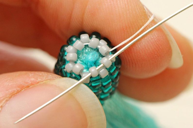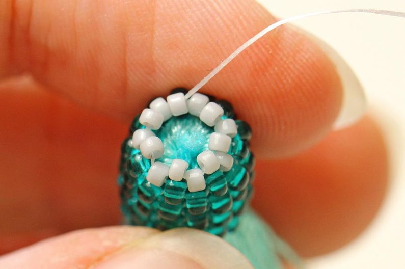 Opět opakujeme s TR15, dalších 7 korálků všijeme do mezer. Díky menší velikosti rokajlu se nám začne korálkový kaplík uzavírat.