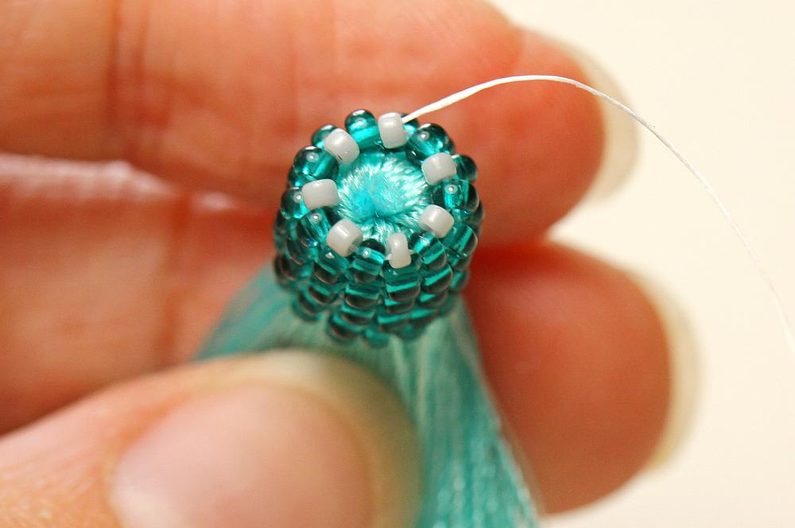 Kroužek si navlékneme na vrchol střapce a do mezer z minulé řady všijeme vždy po jednom PR10 (opět 7x).