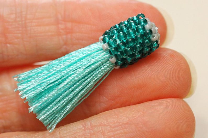 Vrátíme se na začátek (jehlu stačí prostě jen propíchnout skrz střapec a navázat v první řadě, kde přidáme ještě jednu řadu z TR15. Zapošijeme a ustřihneme očko střapce, které nebudeme potřebovat.